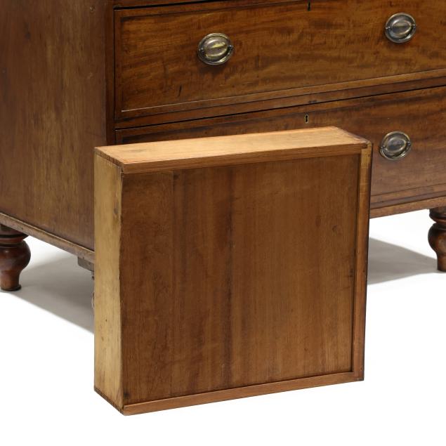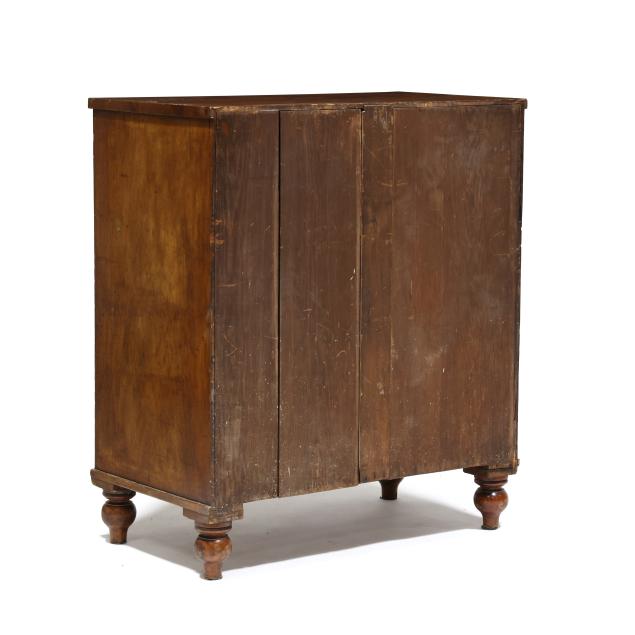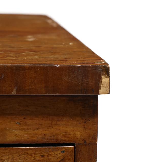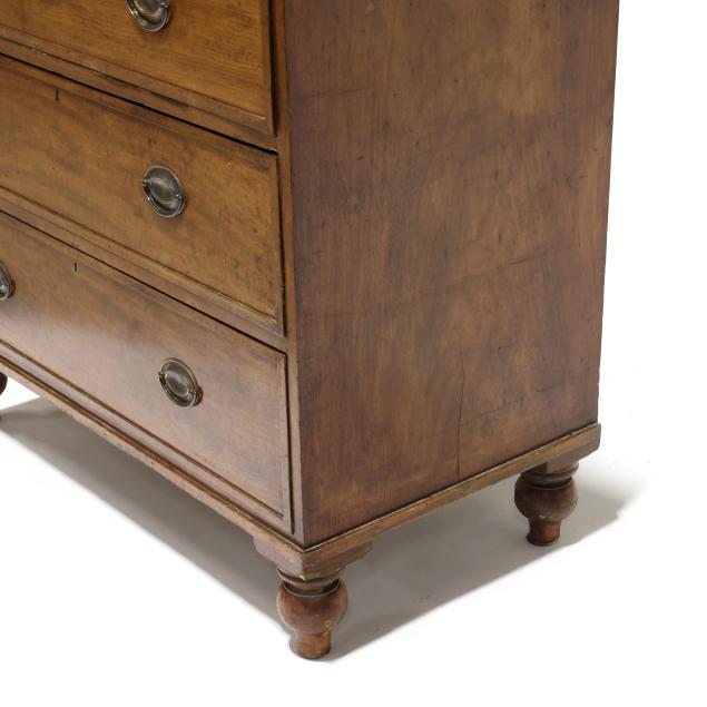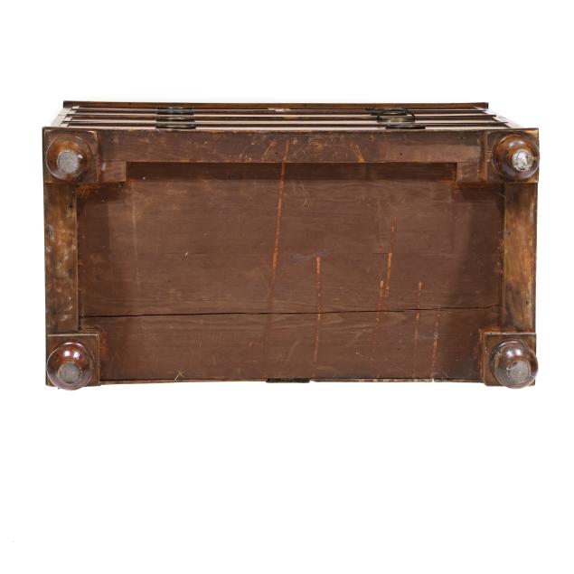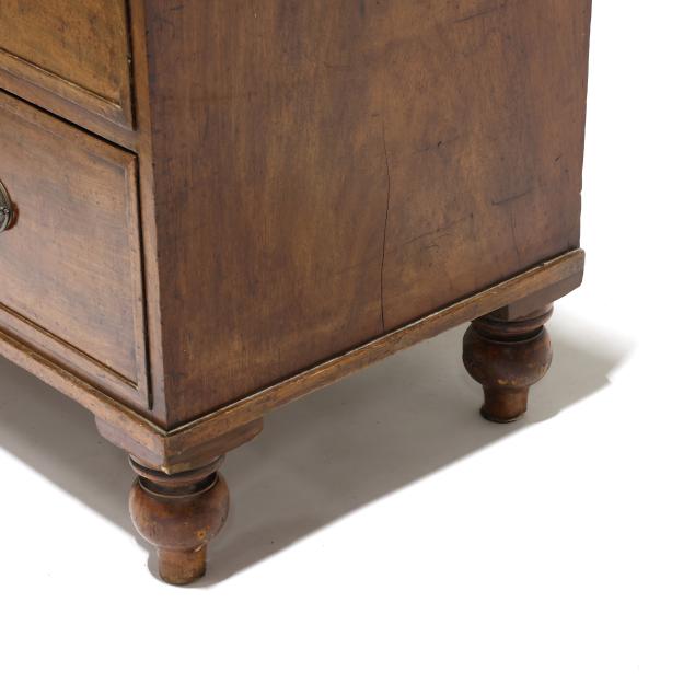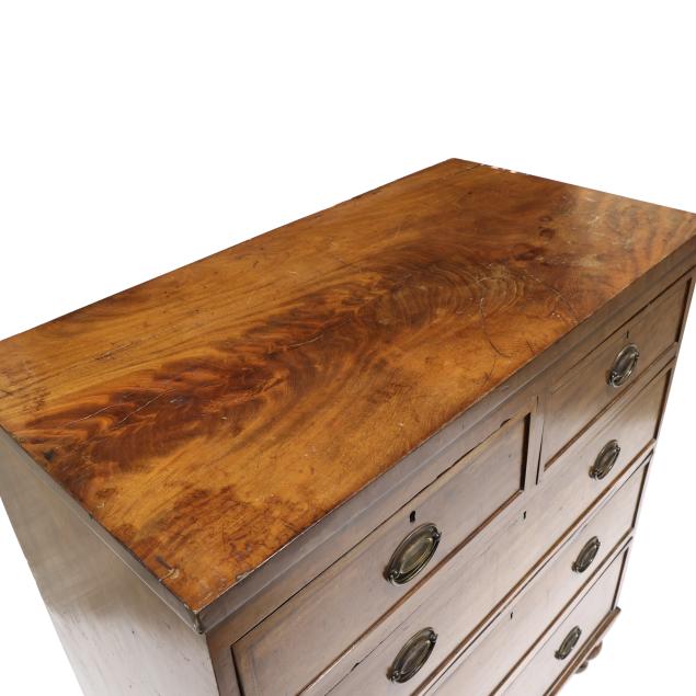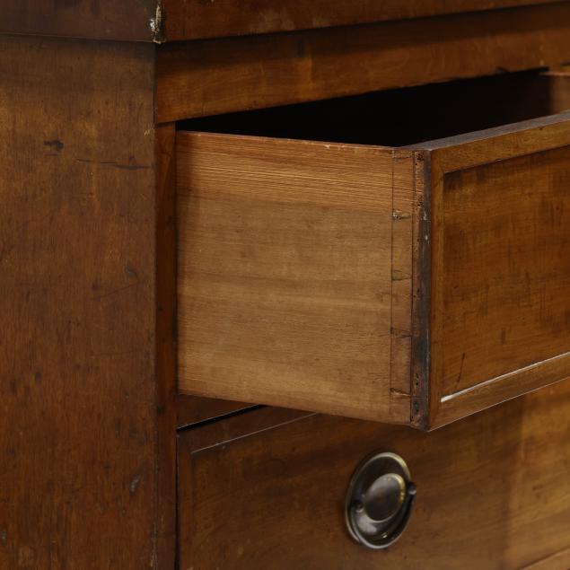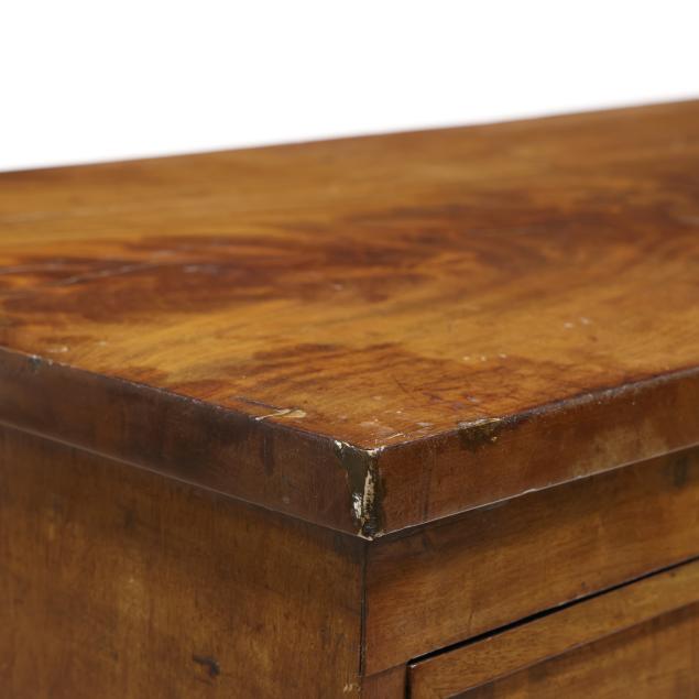Private Collection, Aiken, South Carolina Top with shrinkage cracks, denting, scratches and veneer chips; pulls are old and in the original holes; old marring and some shrinkage cracks to case sides; feet are old and appear original.