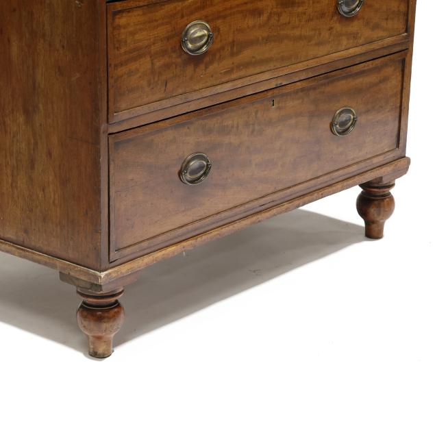 Early 19th century, mahogany veneer, deal and pine secondary, rectangular top with vertically veneered edge, two over three drawers with raised banded edge, turned feet.