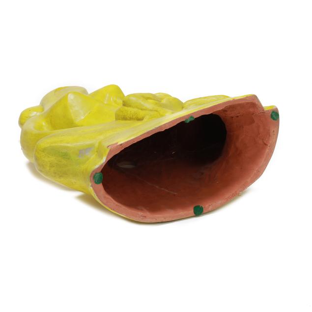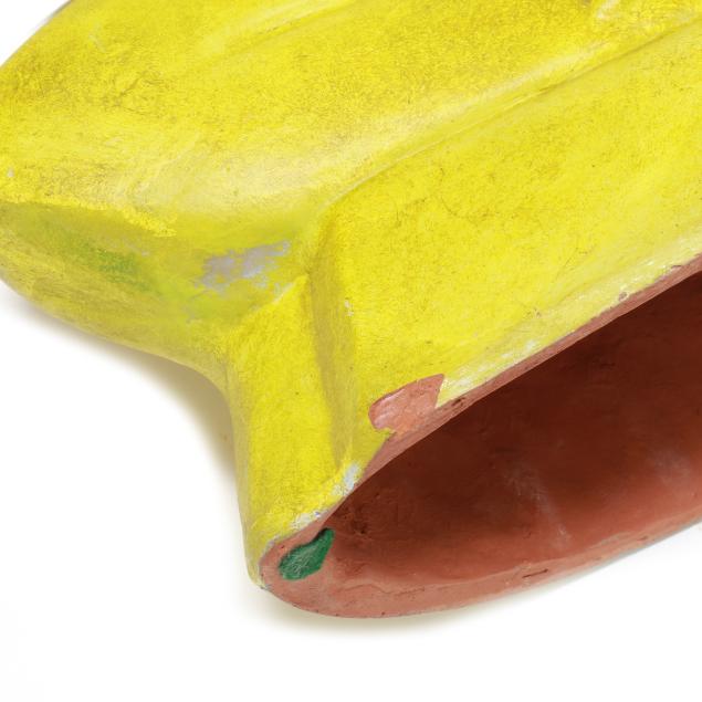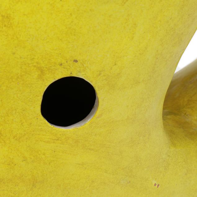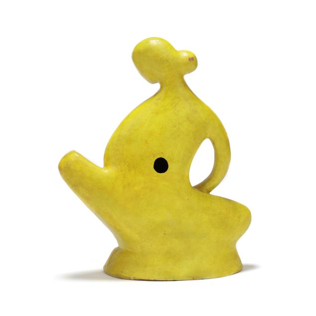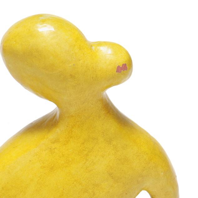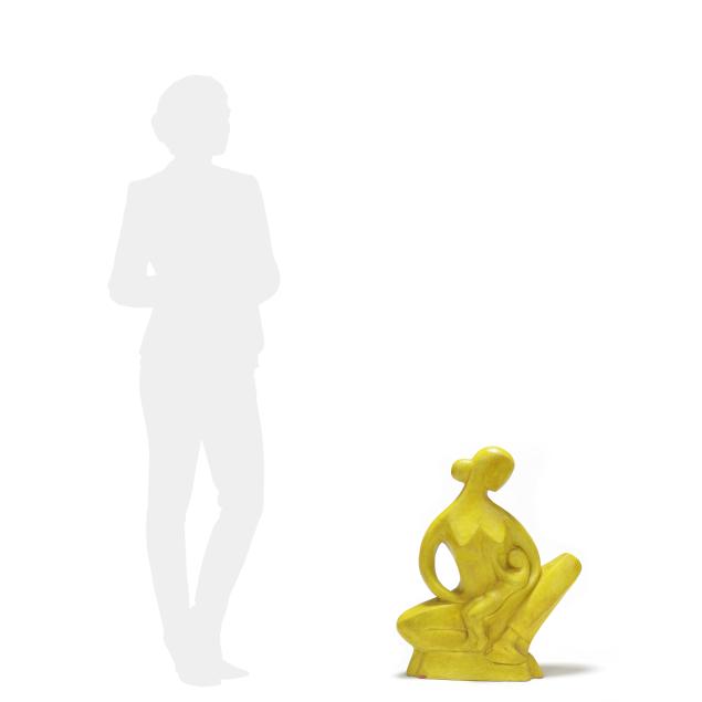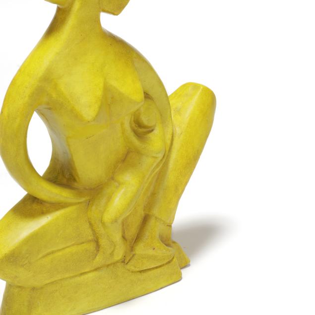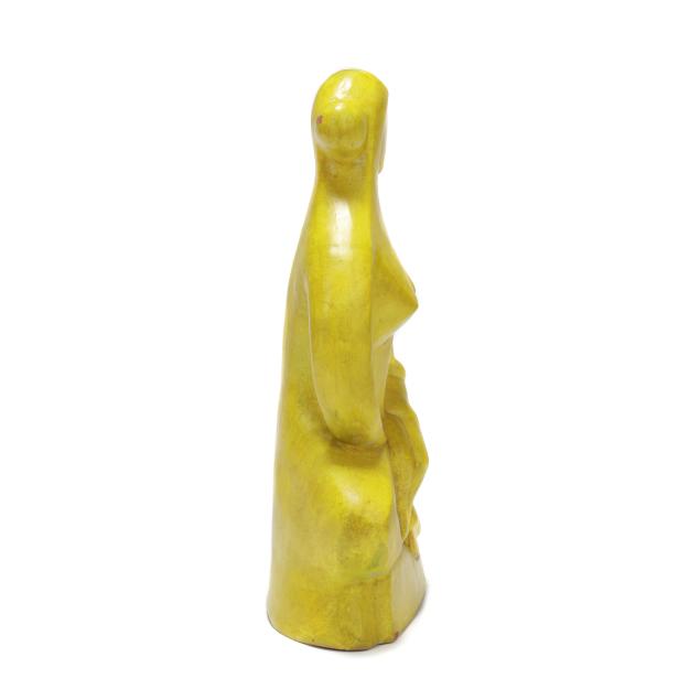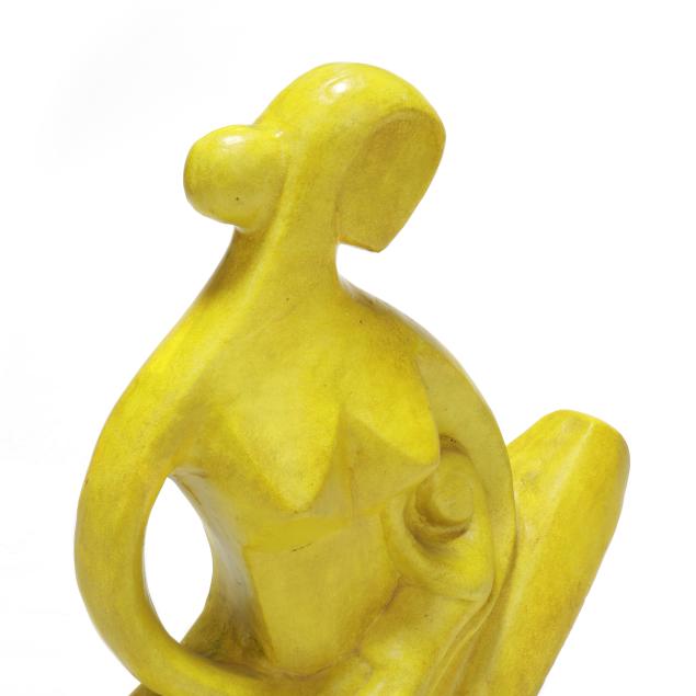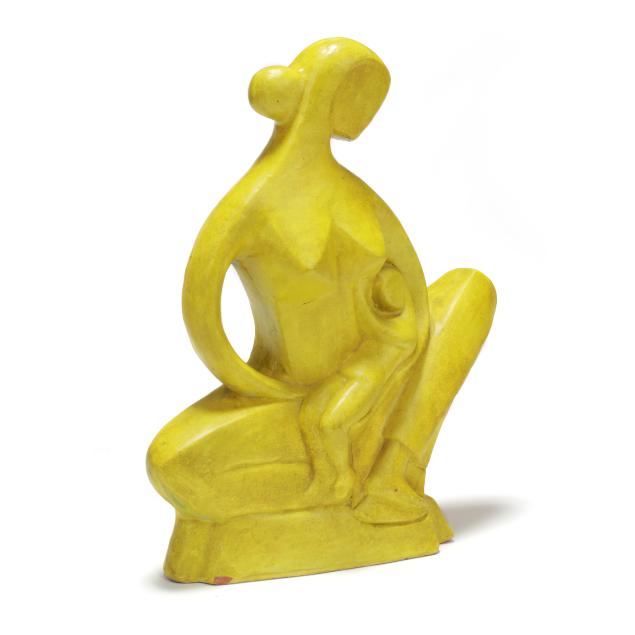 Mid- to late 20th century, greenish yellow glazed terracotta modernist sculpture of mother holding child, appears unsigned, includes tag from Gallery 20.