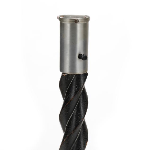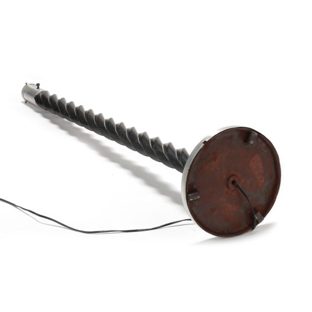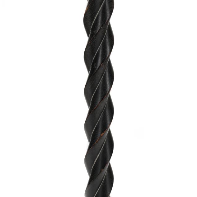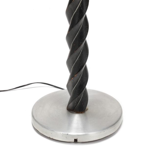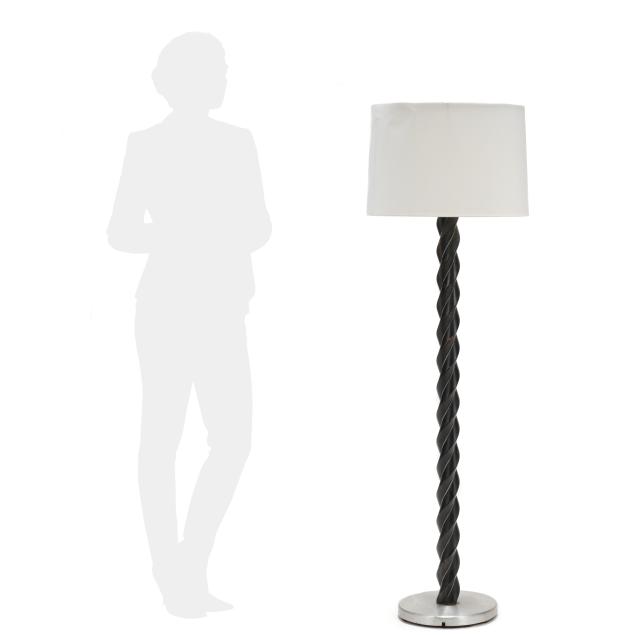 Mid-20th century, possibly Gerald Thurston for Lightolier, one light form floor lamp with ebonized wood carved in spiral to form stem, metal mount and base, includes silk shade.
