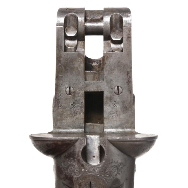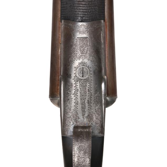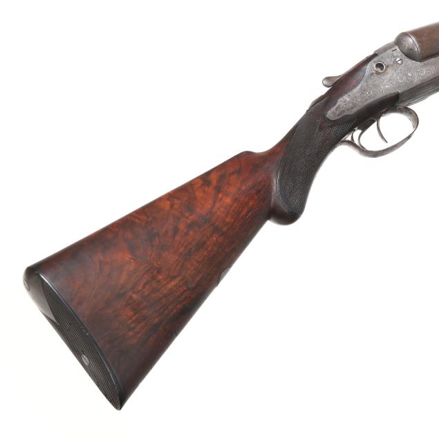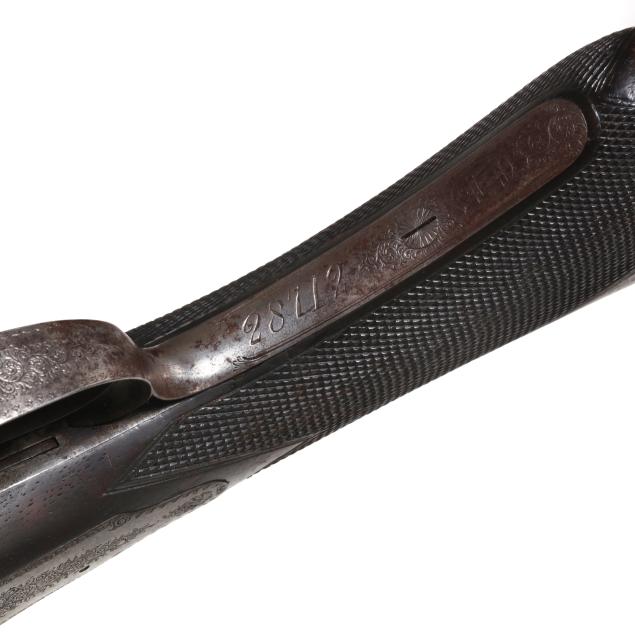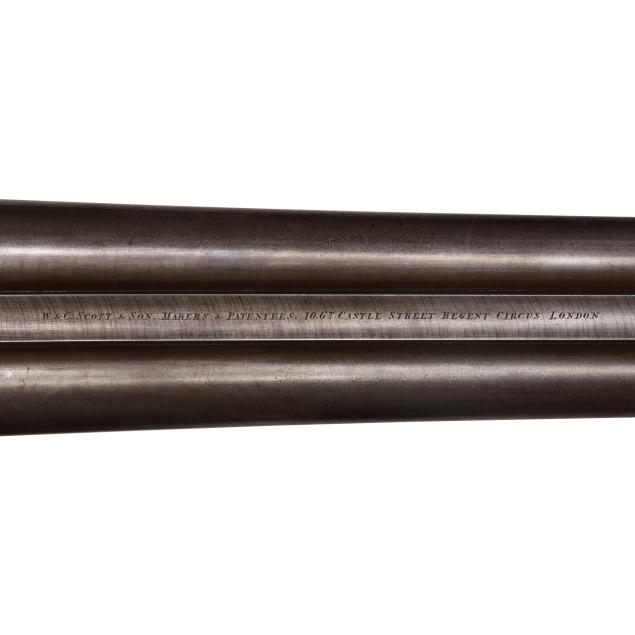 Serial number 28712 present on barrel flats, left barrel, forend iron and trigger guard, text of PATENT CRYSTAL INDICATOR present on left and right hammer lock plates of engraved and coined hammerless action receiver, text of W & C SCOTT & SON PATENT BLOCK SAFETY HAMMERLESS present on left lock plate, text of W & C SCOTT & SON PATENT present on top lever, text of NOT FOR BALL 10B 11M present on 25 7/8 in. damascus barrel, text of W & C SCOTT & SON MAKER'S & PATENTEES 10 Gt. CASTLE STREET REGENT CIRCUS LONDON present on smooth twist top rib with single bead, cocking indicators, double triggers, automatic safety, floral engraving, checkered Price Of Wales grio walnut buttstock, checkered walnut splinter forend, engraved forend release lever, stock oval along toe line, checkered horn buttplate.