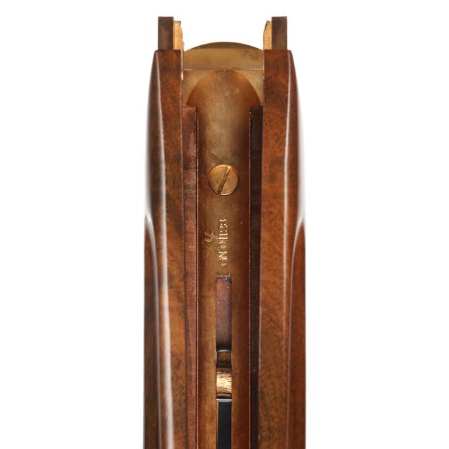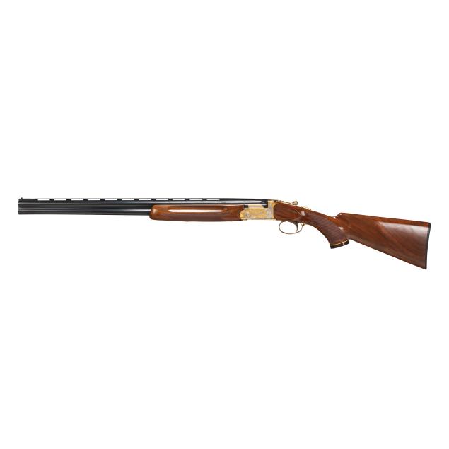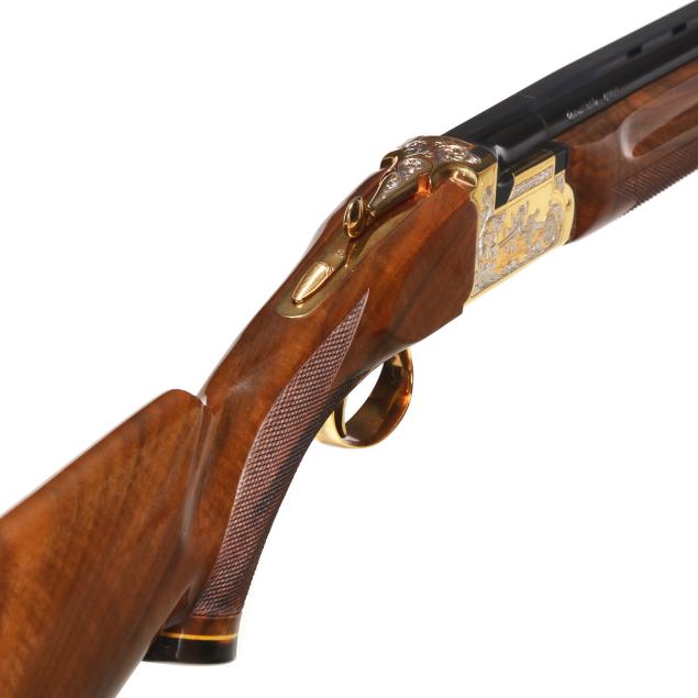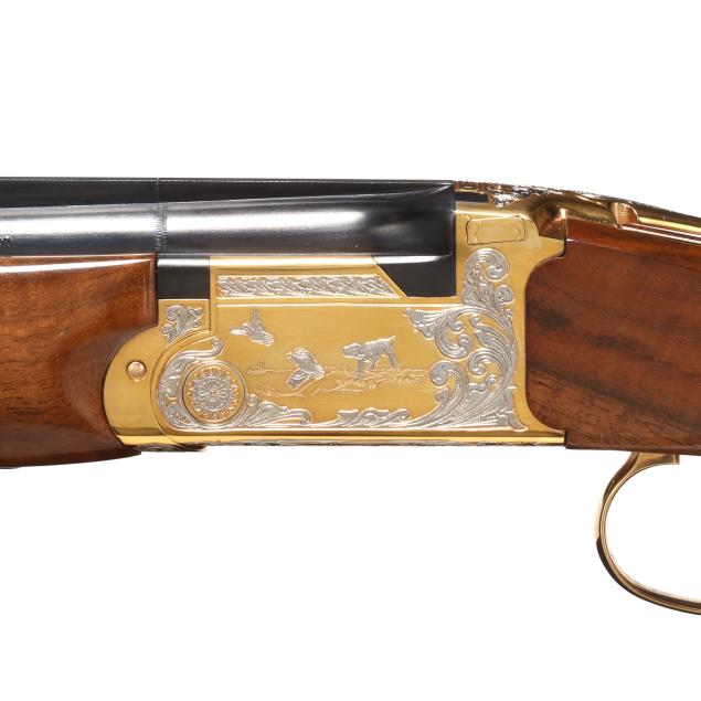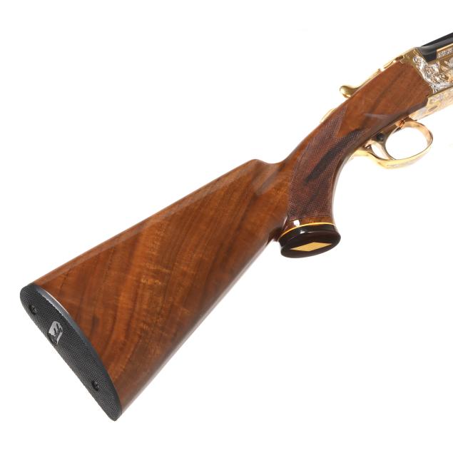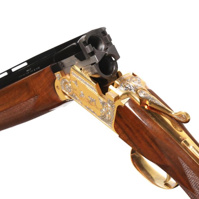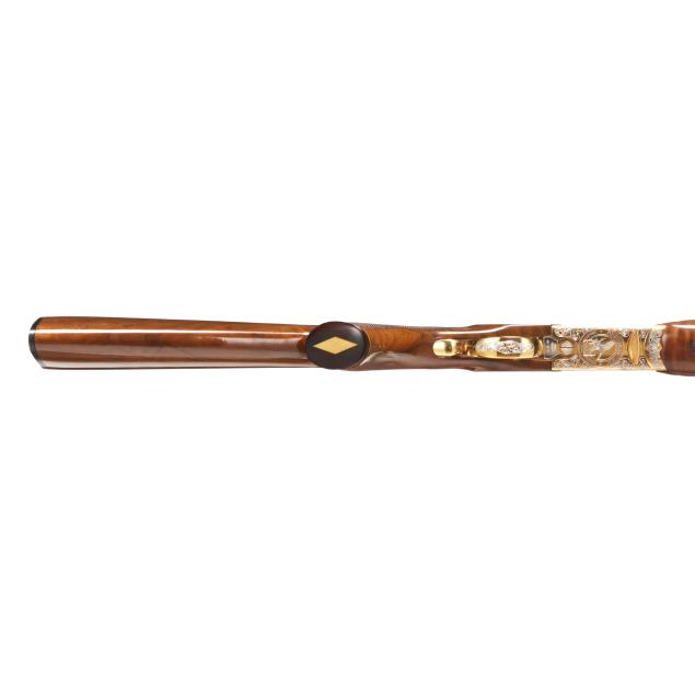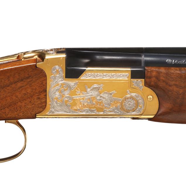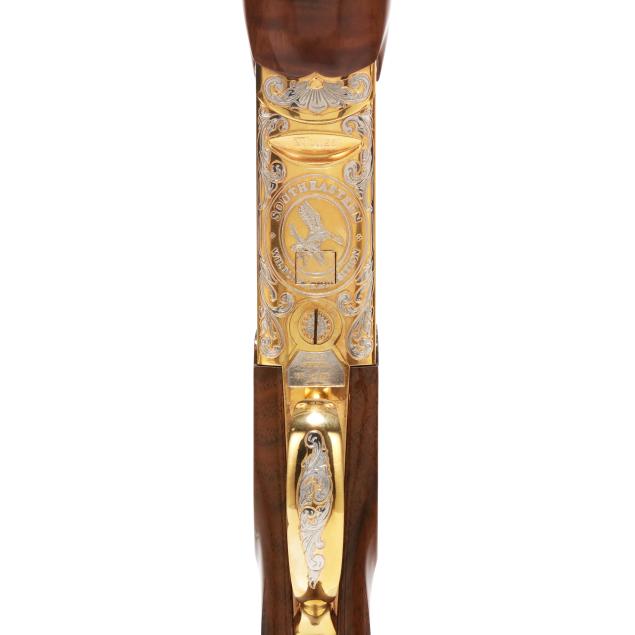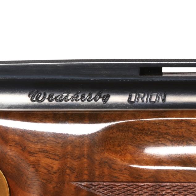 Serial number GN 01128 present on belly of engraved gold colored O/U receiver, forend iron and barrel, text of SOUTHEASTERN WILDLIFE EXPOSITION present on belly of receiver, text of GOLD SERIES 18 0F 25 and MARK ARMSTRONG A&A ENGRAVING, RAPID CITY SD present on trigger plate, text of 1991 present on top of receiver, text of 20GA - 3" SOUTH GATE, CALIF. MADE IN JAPAN and WEATHERBY ORION present on 26 in. vent ribbed barrels with matted top rib and single bead, ejectors, gold washed trigger, manual safety, checkered cappe pistol grip walnut buttstock, checkered walnut forend, factory buttplate.