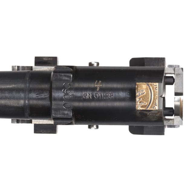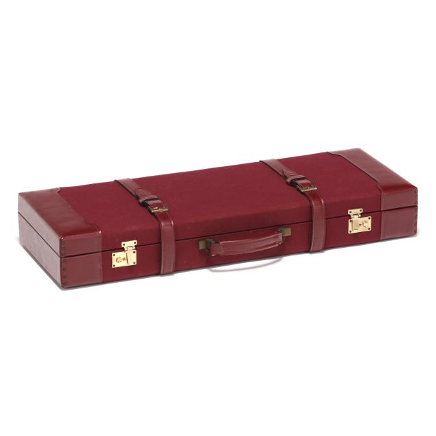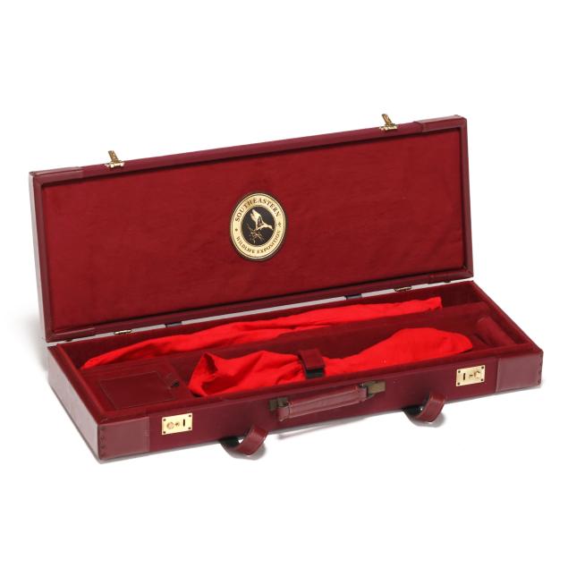Canvas and leather covered hard take-down case with additional choke tube, choke tube wrench, snap caps, case key, felt sleeves for barrel and receiver