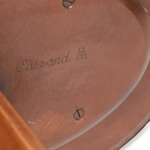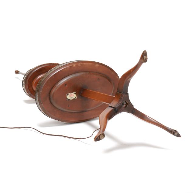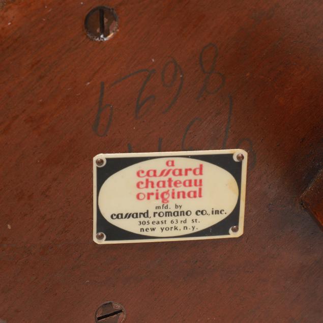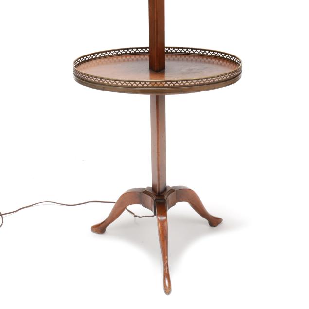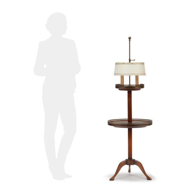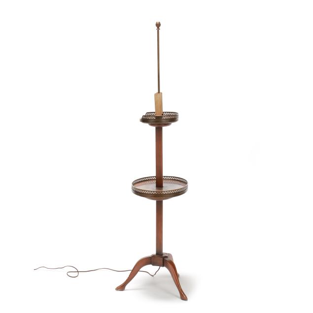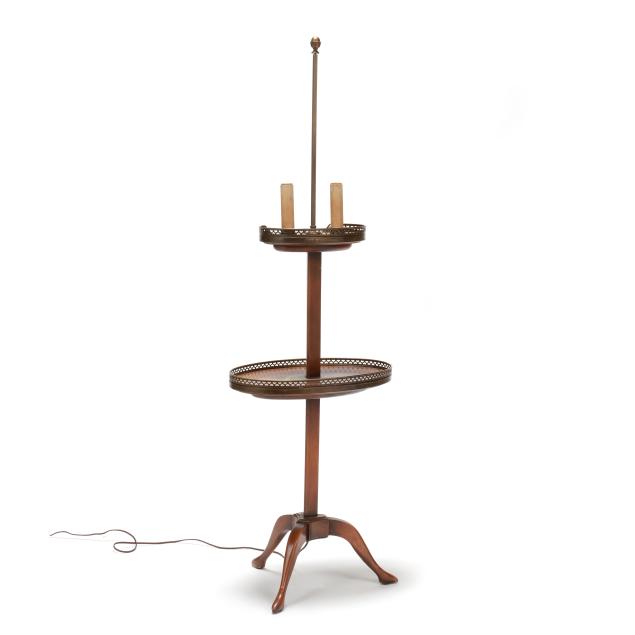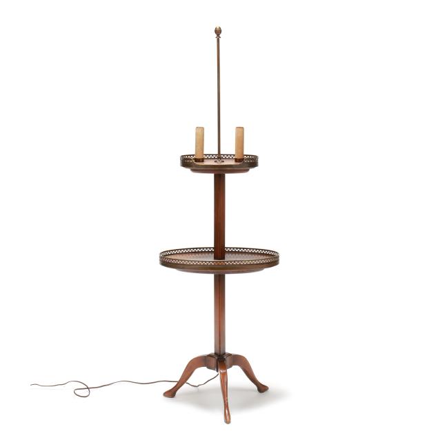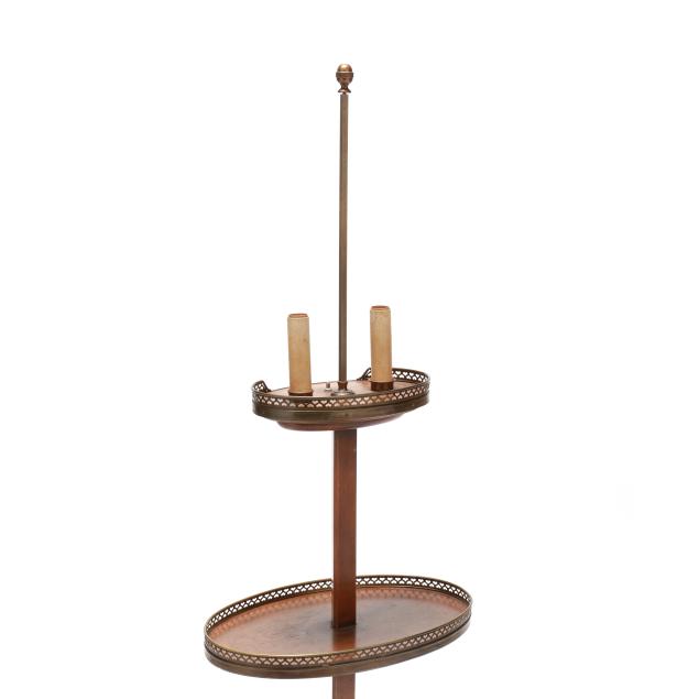 New York, mid-20th century, "Cassard Chateau Original" floor lamp manufactured by Cassard Romano Co., Inc., wood stem and base with two oval tables, reticulated brass mounts, two faux candle form lights, white and gilt metal shade, labeled to underside of lower oval table.