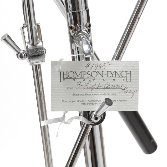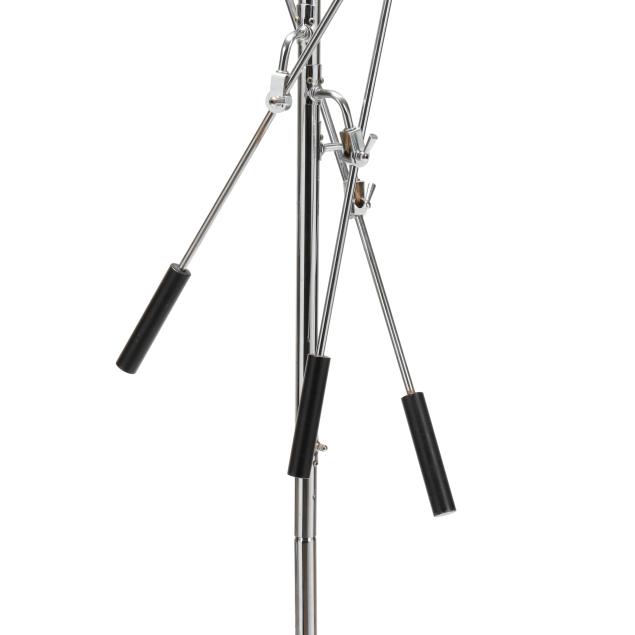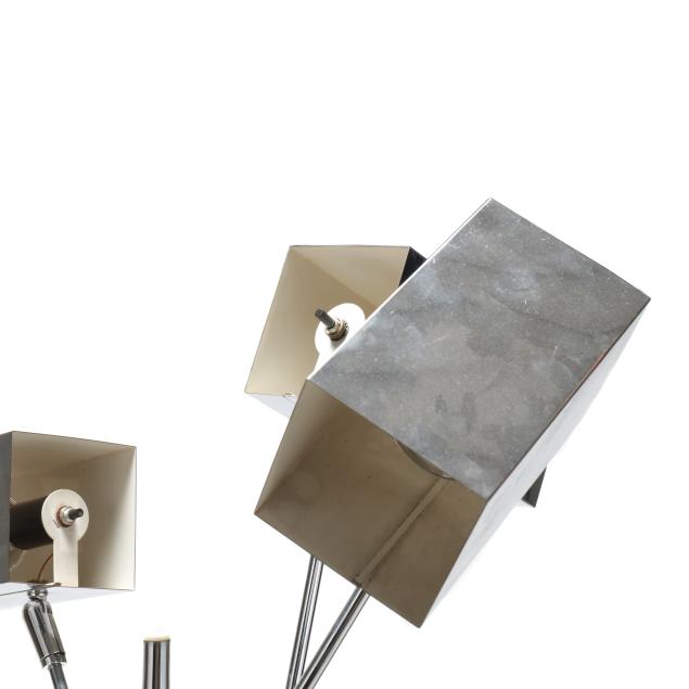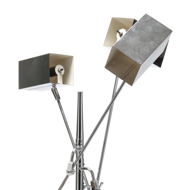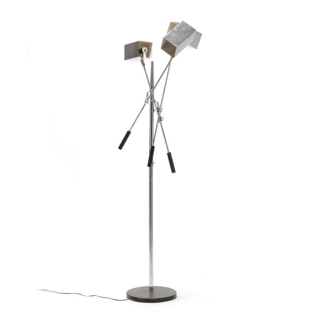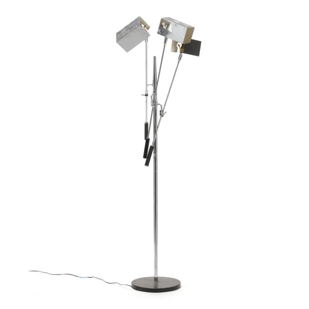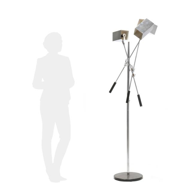 Late 20th century, metal floor lamp with chrome finished stem and rectangular shades, three-light form with adjustable arms and shades, mounted to black circular base.