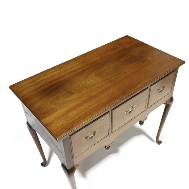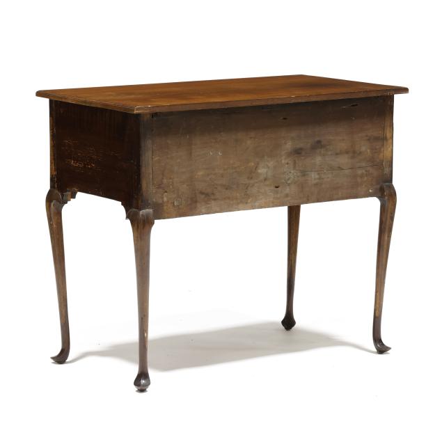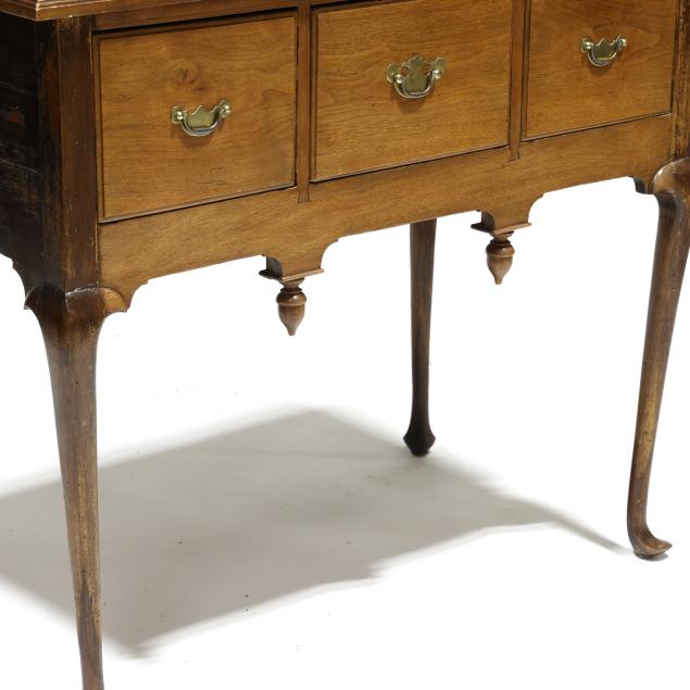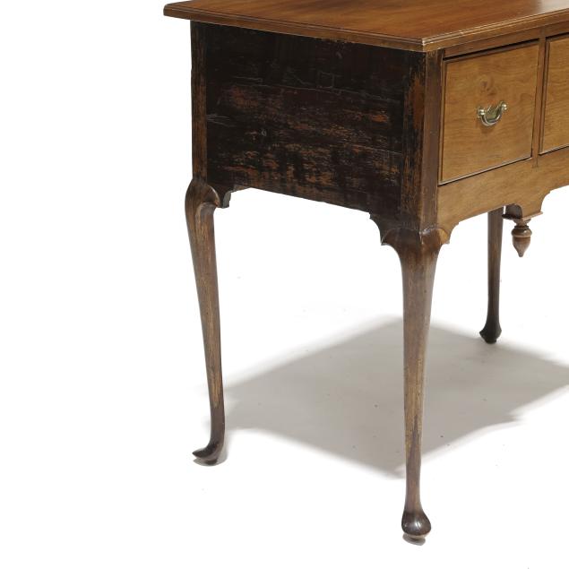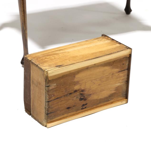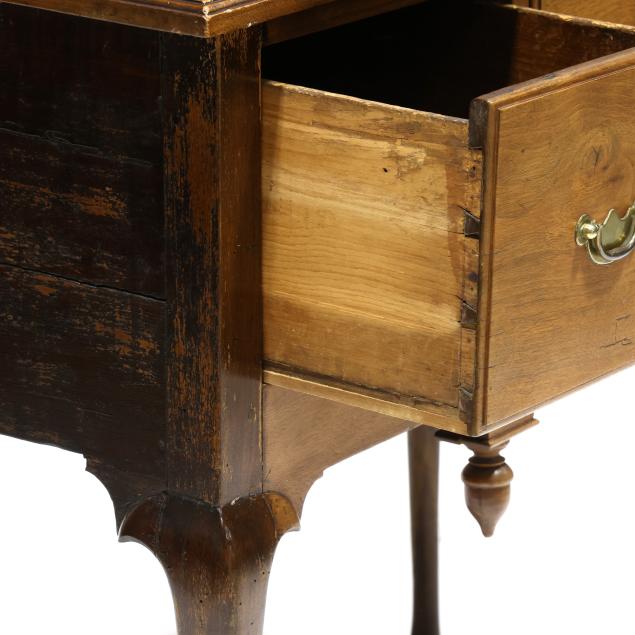 Old but later top; drawer runners and guides rebuilt; pulls are old and in the original holes; all four legs tipped the lower half; later acorn finials.