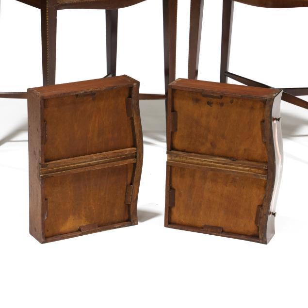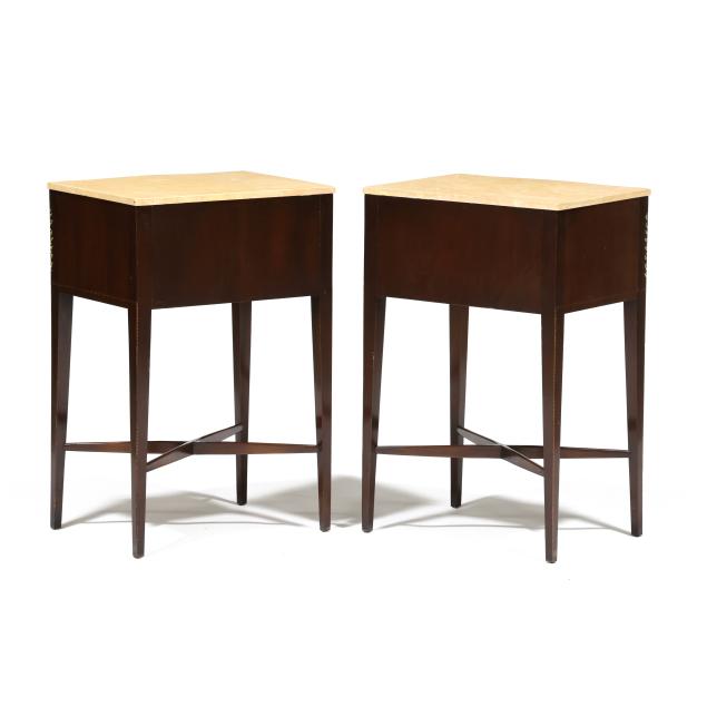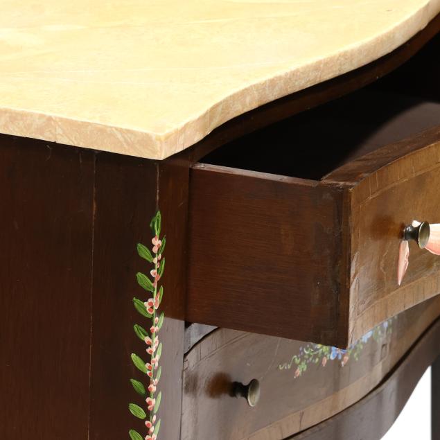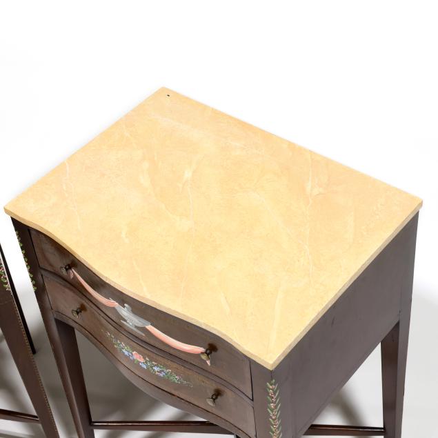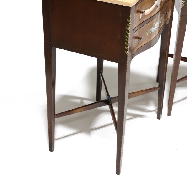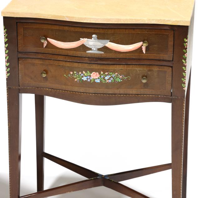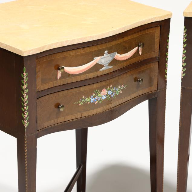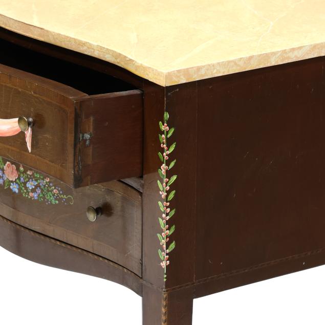 Mid 20th century, mahogany veneer, faux marble painted tops, two serpentine drawers with banded inlay and painted highlights, barber pole inlaid skirt and leg edges with painted floral stiles.