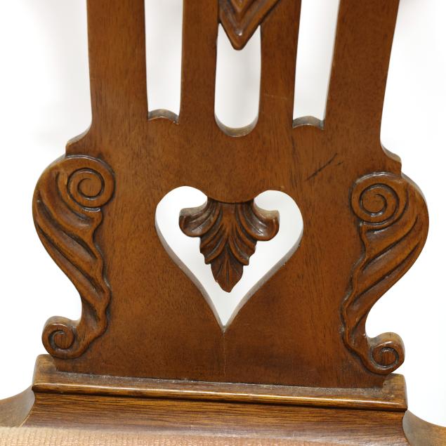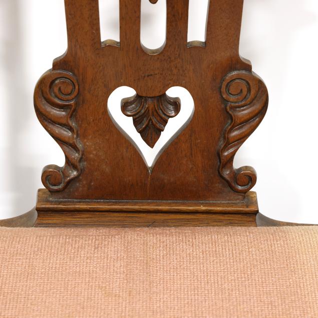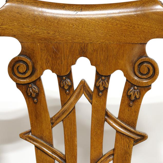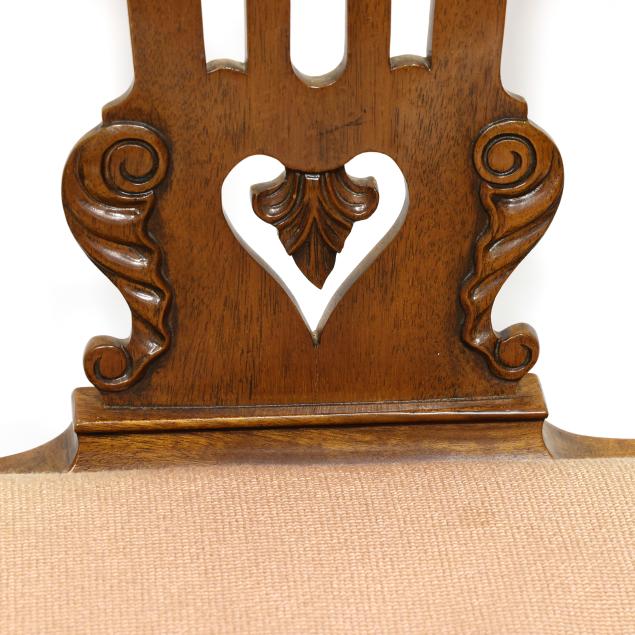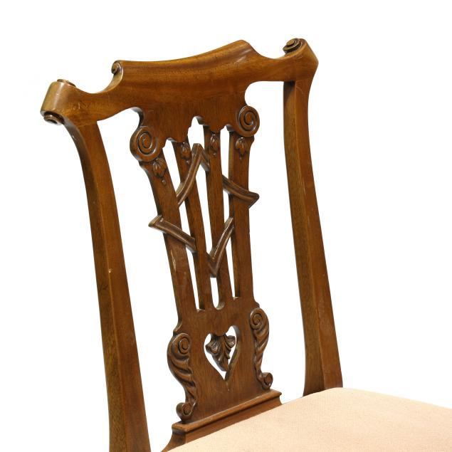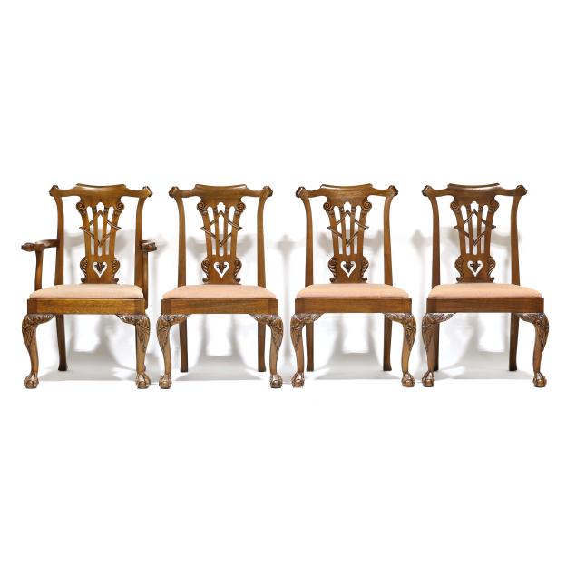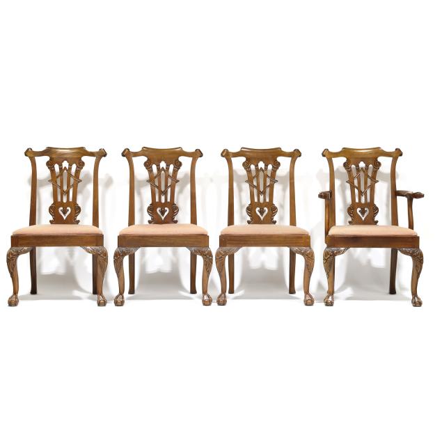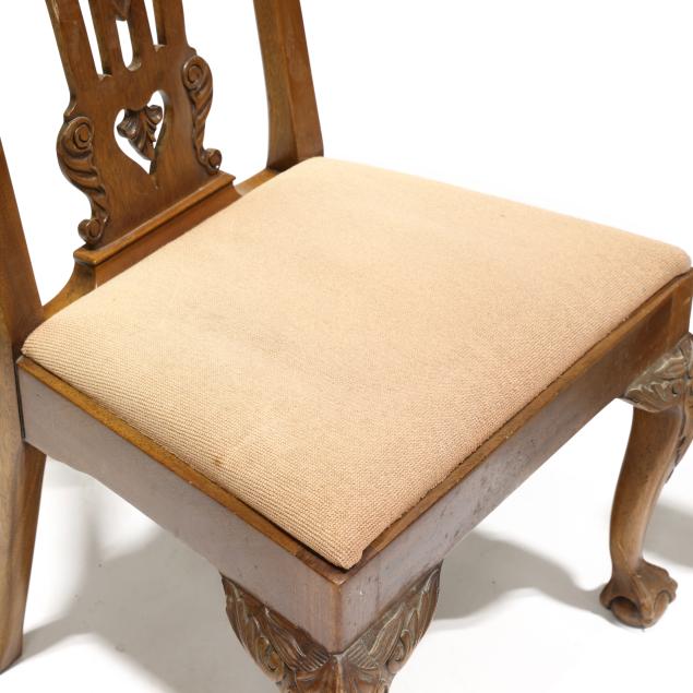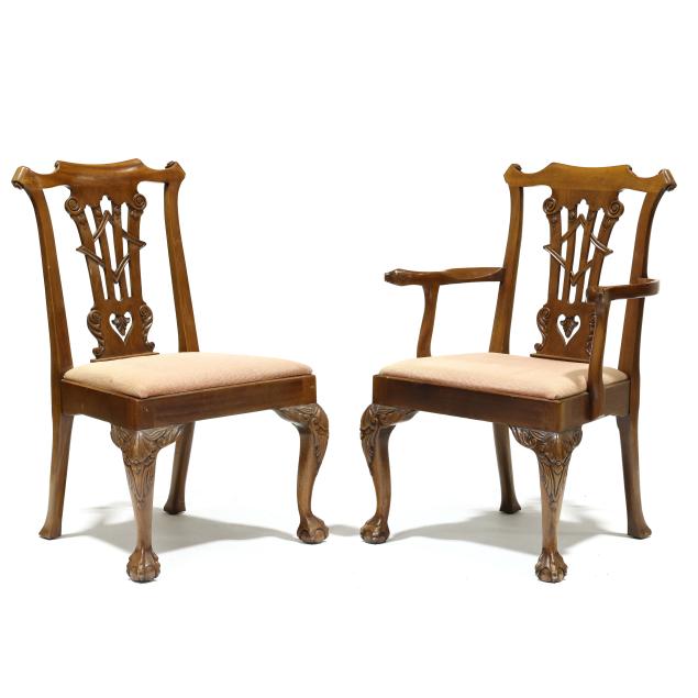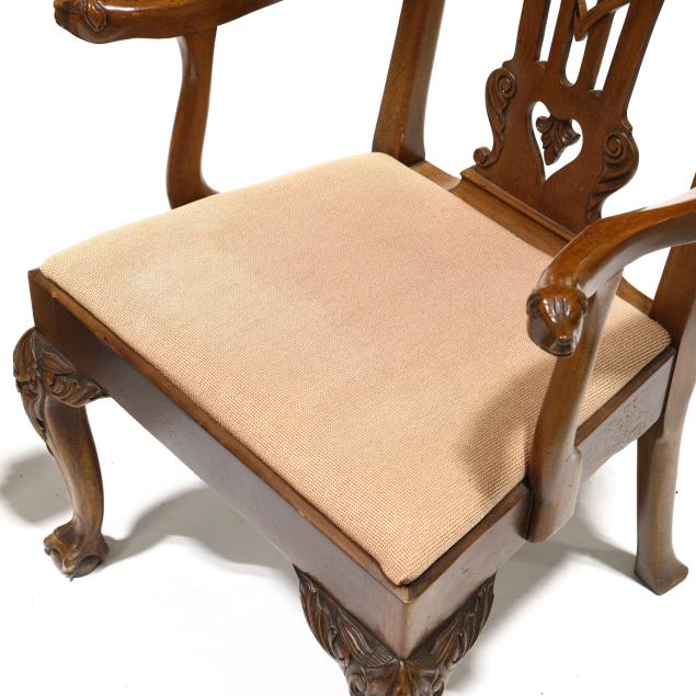Second half 20th century, including two armchairs and six side chairs, shaped crest rail with scrolled ears, pierced and relief carved back splay, needlepoint slip seats, front cabriole legs with shell and bellflower carved knees on ball and claw feet, the arms feature dog head terminus.