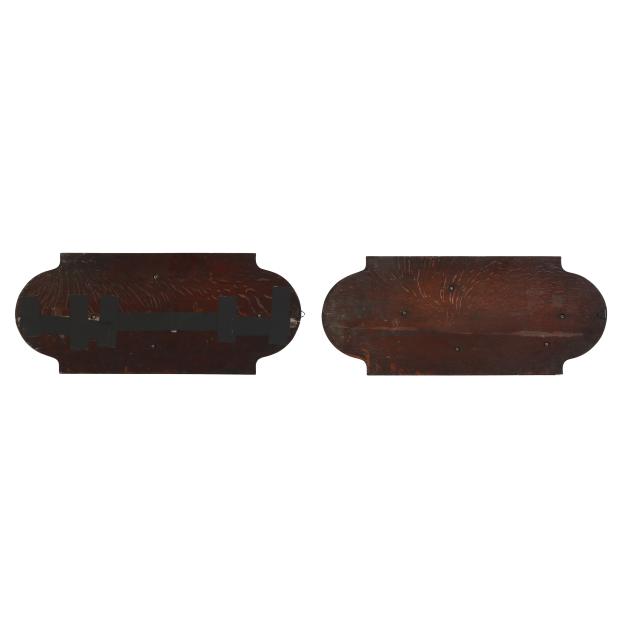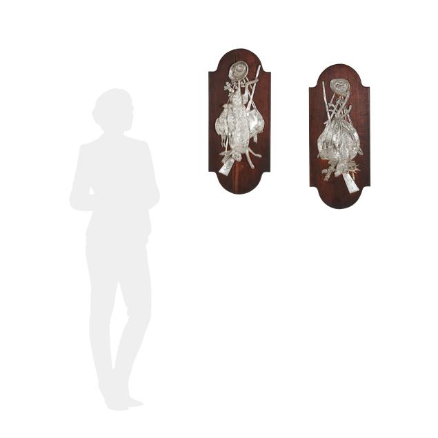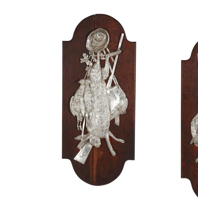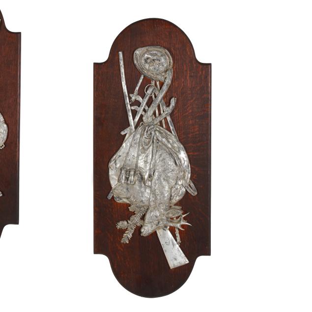 Cast relief plaques with silver-plated finish, signed in the casting, mounted on a tiger oak panels, one centering a trophy hare and pheasants, the other a stag, each festooned with rifle, hat, and other hunt theme accessories.
