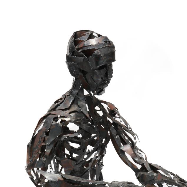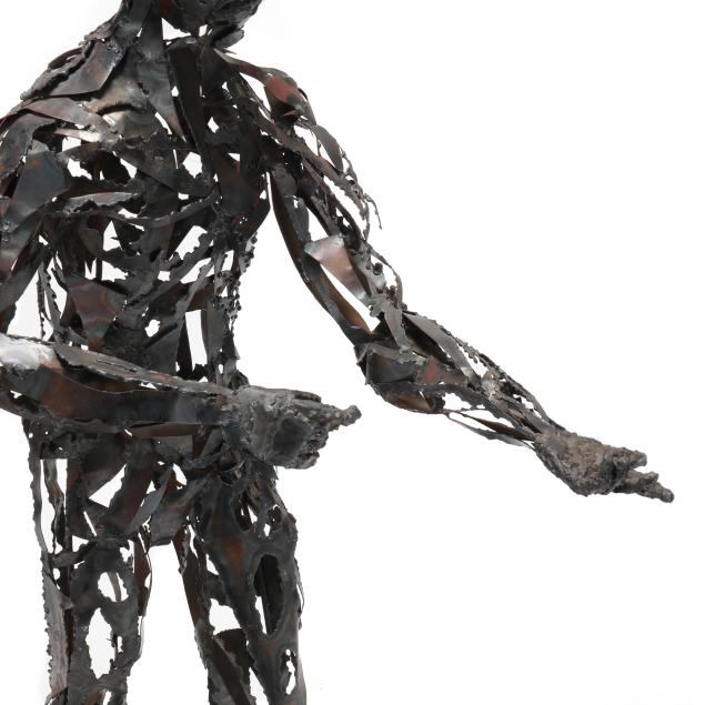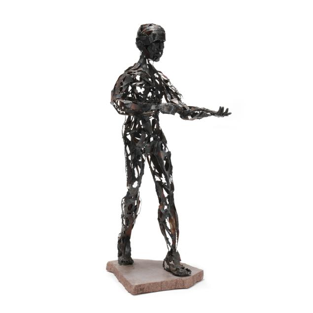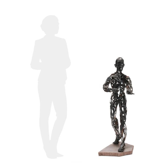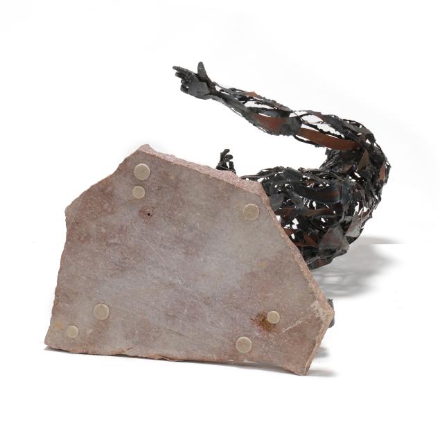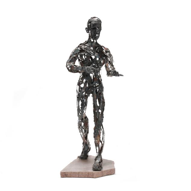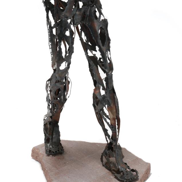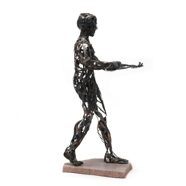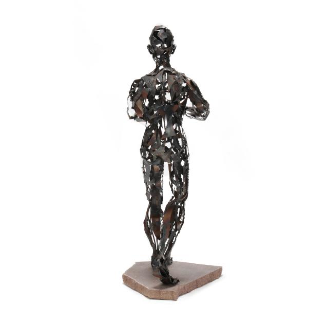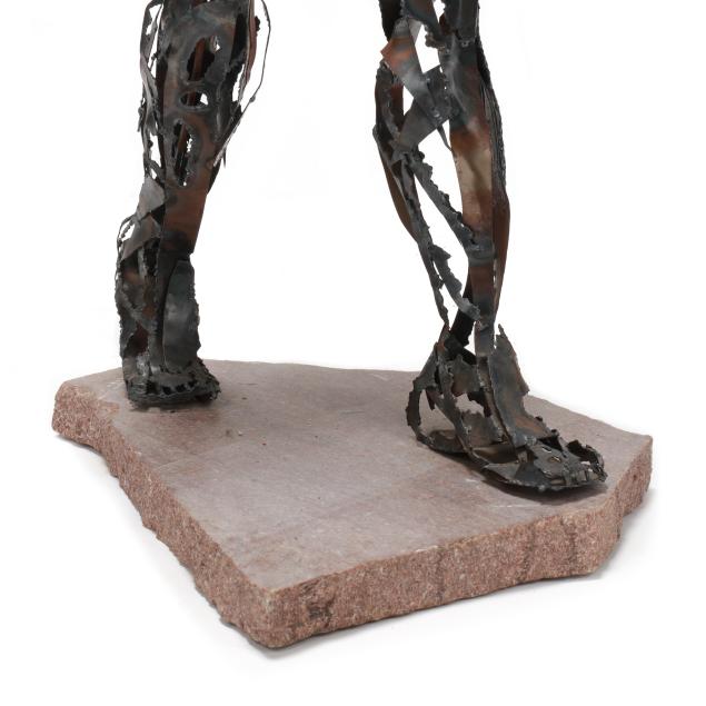 Contemporary, soldered metal sculpture in the form of a man in motion mounted to rough cut stone base, appears unsigned, Gallery 20 label titles the work