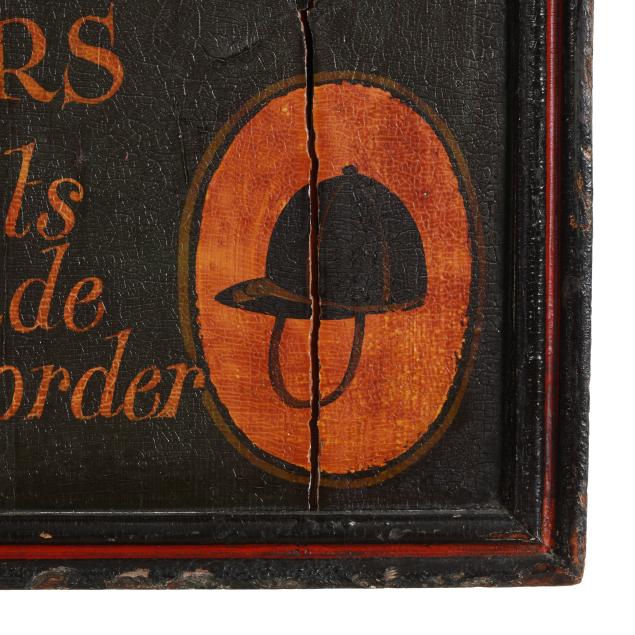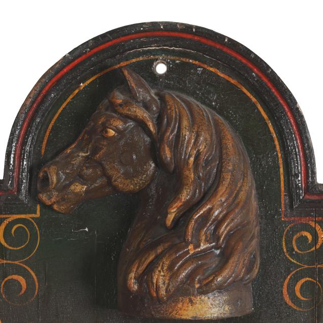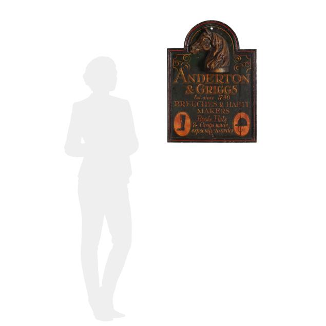Late 19th to early 20th century, likely English, polychrome painted wood sign for Anderton & Griggs riding habit makers with a high relief horse's head to top, fitted to verso with newer wire for display.