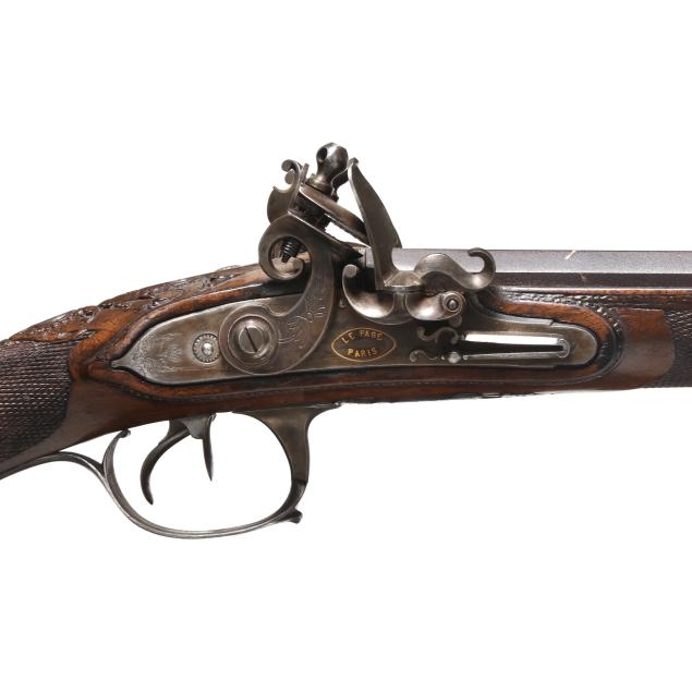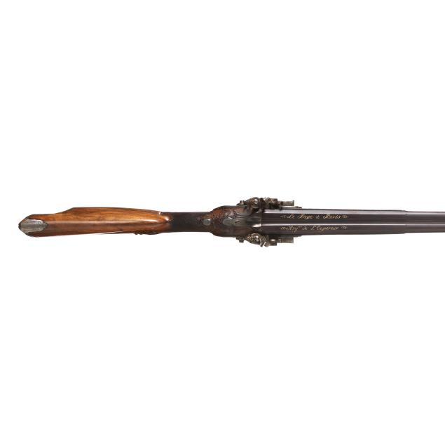 No visible serial number present (NVS), gold colored text of LE PAGE PARIS present on highly ornate flint lock mechanism lock plates, gold colored text of LE PAGE PARIS L'EMPEREUR and other characters present on browned 31 1/4 in. barrels with blade front sight, double triggers, sling loops, ramrod, ornately carved and checkered figured walnut stock with silver trimmings.