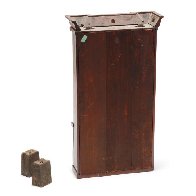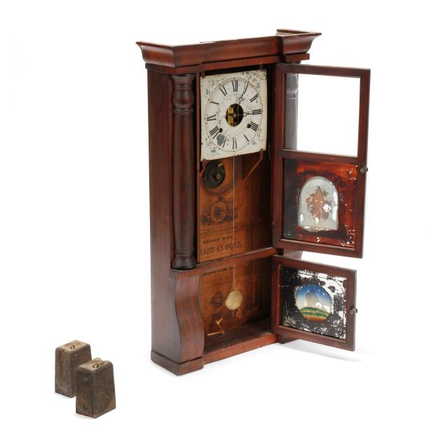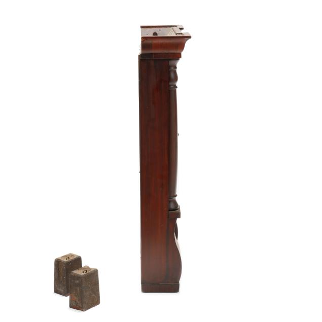 Plymouth, Connecticut, circa 1880s, figured mahogany case with turned half columns over scrolled corbel supports, flanking (2) glass front doors with gilt bordered eglomise panels, eight days brass dual weight-driven movement stamped "S THOMAS / PLYMOUTH CONN. / U.S.A.," operating a hand-painted metal dial with Roman chapters, retaining period label to interior. Includes (2) weights, winding key, and pendulum.