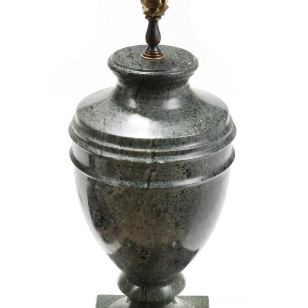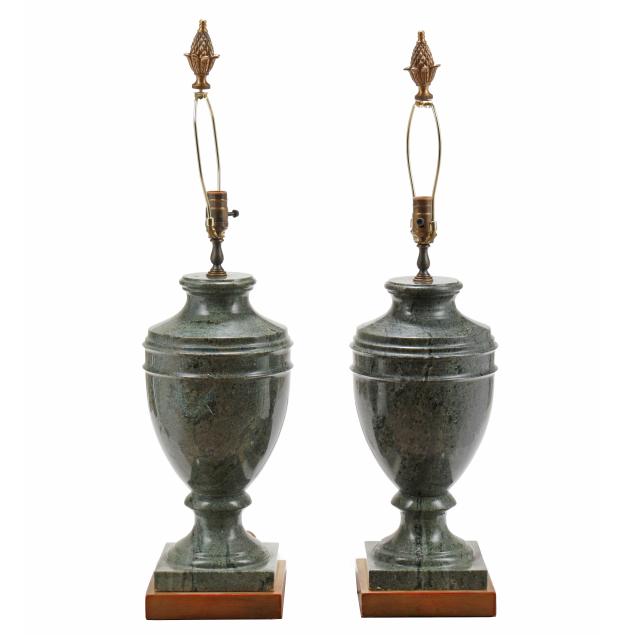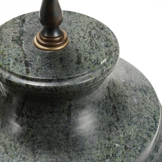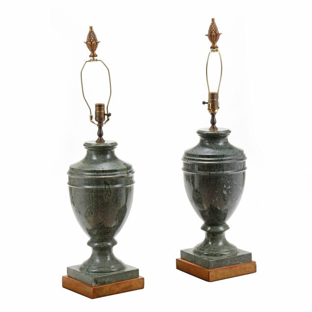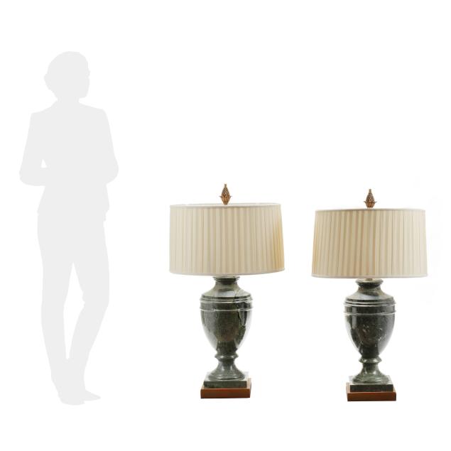 Late 20th century, solid green marble urns mounted to giltwood plinths, brass mount and pineapple form finials, includes (2) pleated silk-lined shades, appears unmarked.