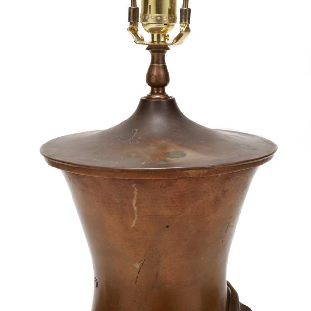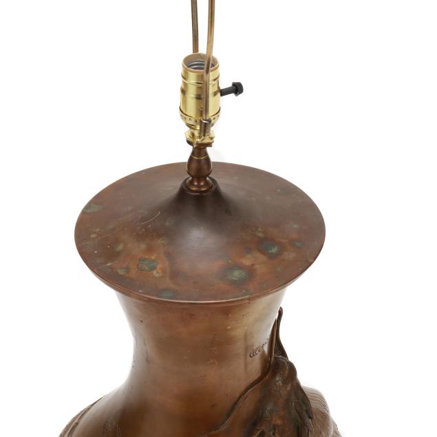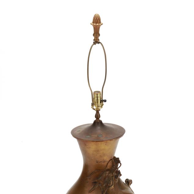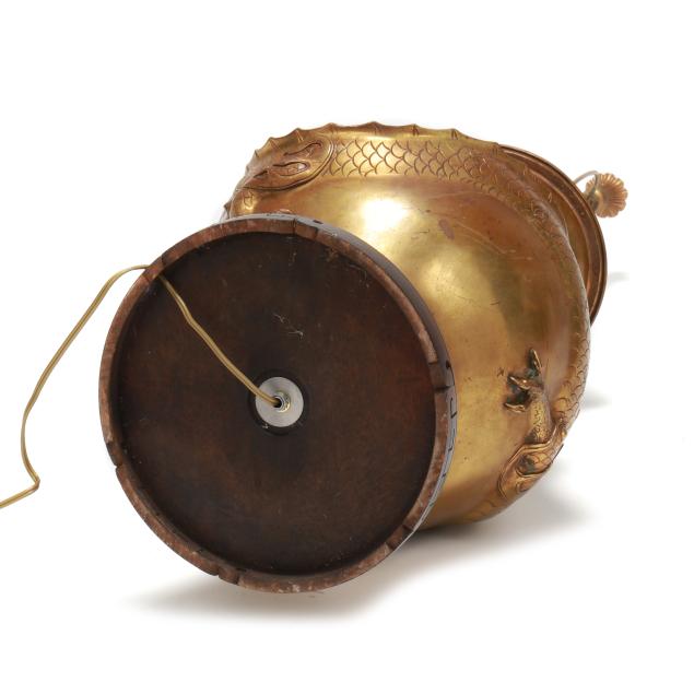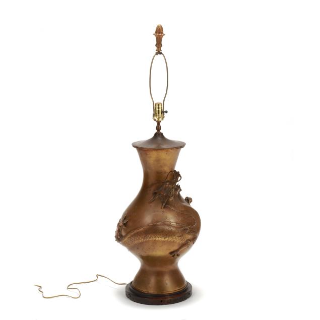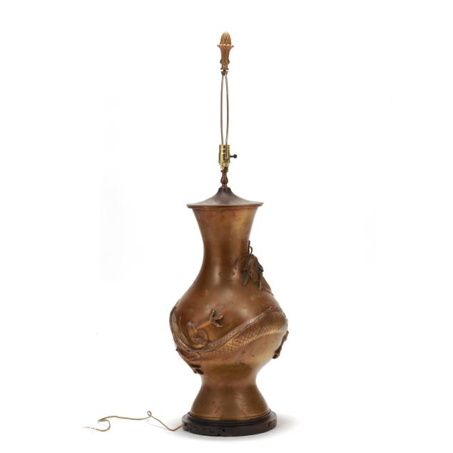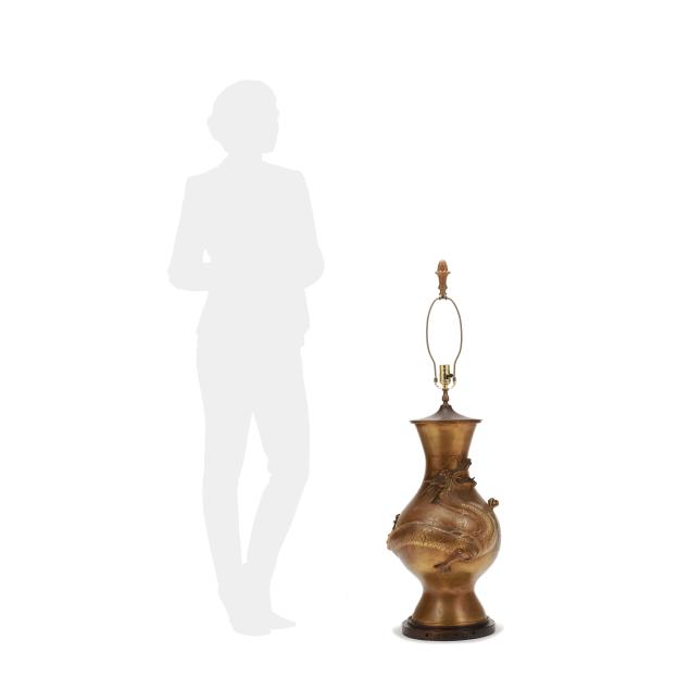 Showa period (1926-1989), a hollow brass urn with high relief dragon clutching a pearl, surrounded by engraved clouds, drilled and fitted as a lamp, with brass mount, carved wood base, and artichoke form gilt and gessoed wood finial.