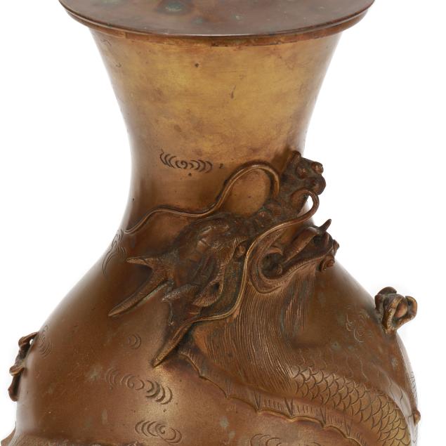 Vase not examined outside of mounts; working at time of evaluation; verdigris mainly to crevices of dragon relief; surface marks and stains to brass; chip to wood base; a few small nicks to finial.
