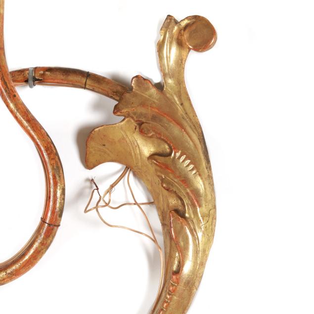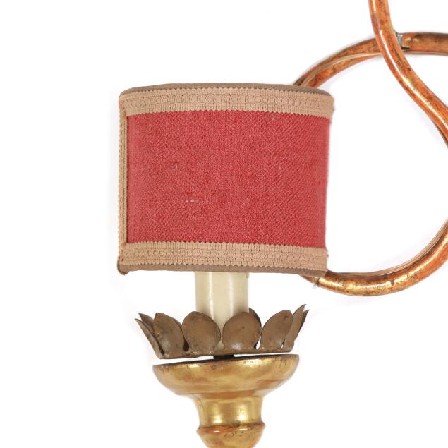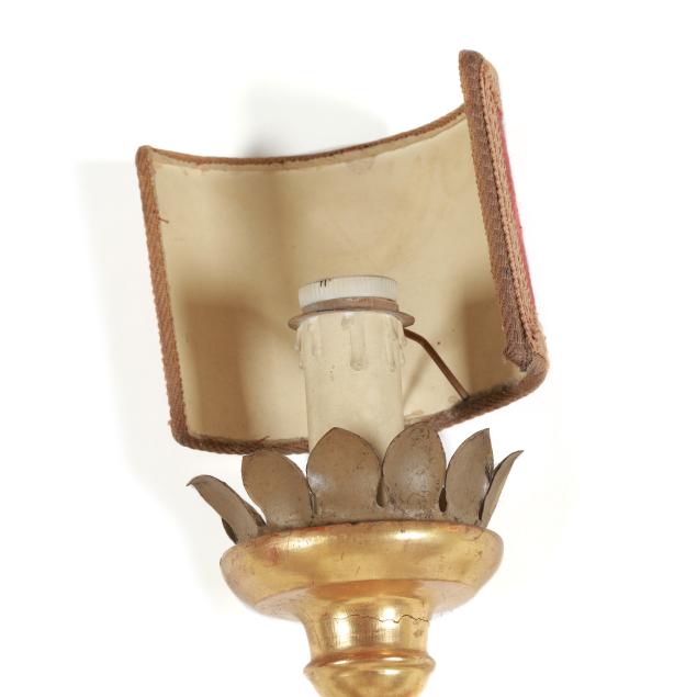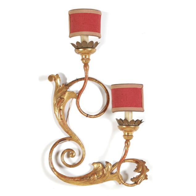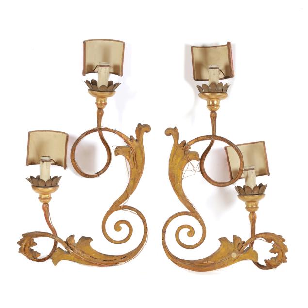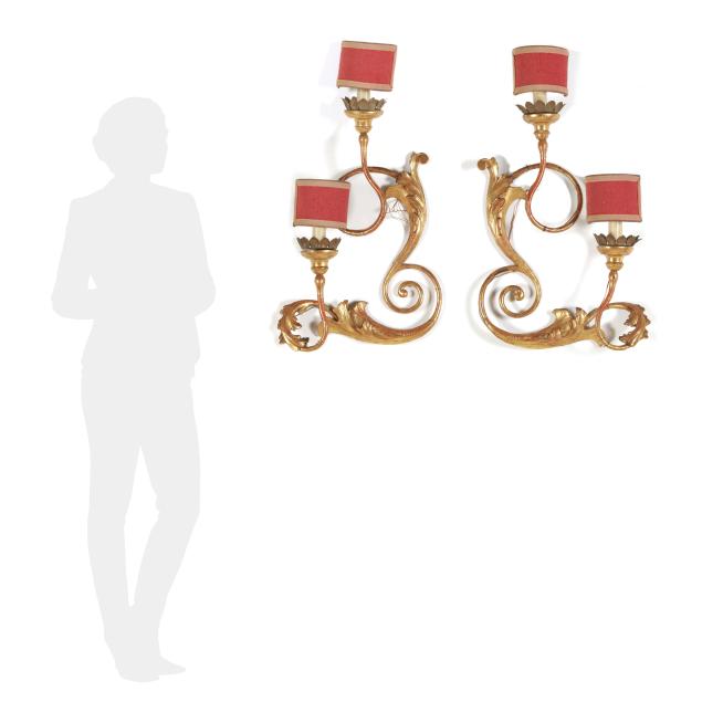 Late 19th to early 20th century, likely French, both two-light form gilt over gessoed wood candelabras with rocaille scrollwork stems and tole bobeches, now electrified with faux candle covers and red cloth half shades.