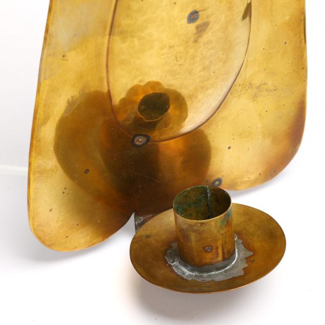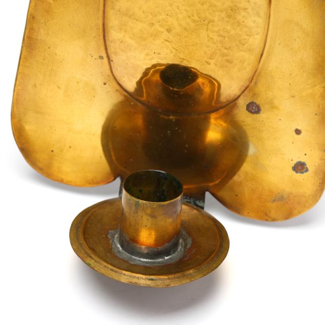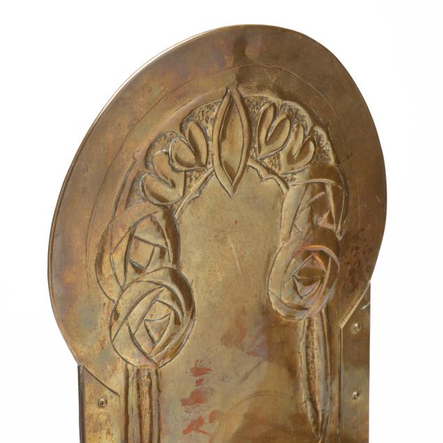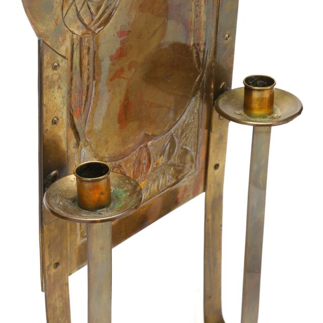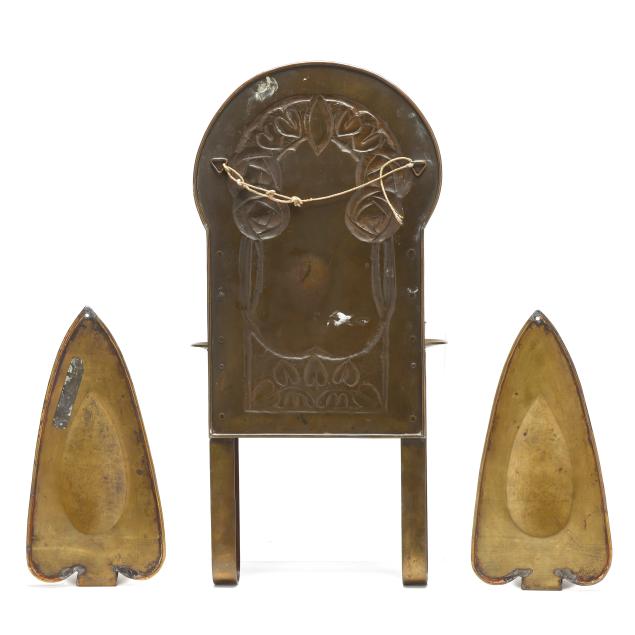 England, early 20th century, (3) Arts and Crafts brass sconces to include a pair of single light sconces in leaf-shape, unmarked (12 x 6 in.); and a Glasgow School two-light sconce with repoussé roses and leaves, unmarked (21 1/2 x 10 1/2 in.).