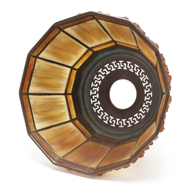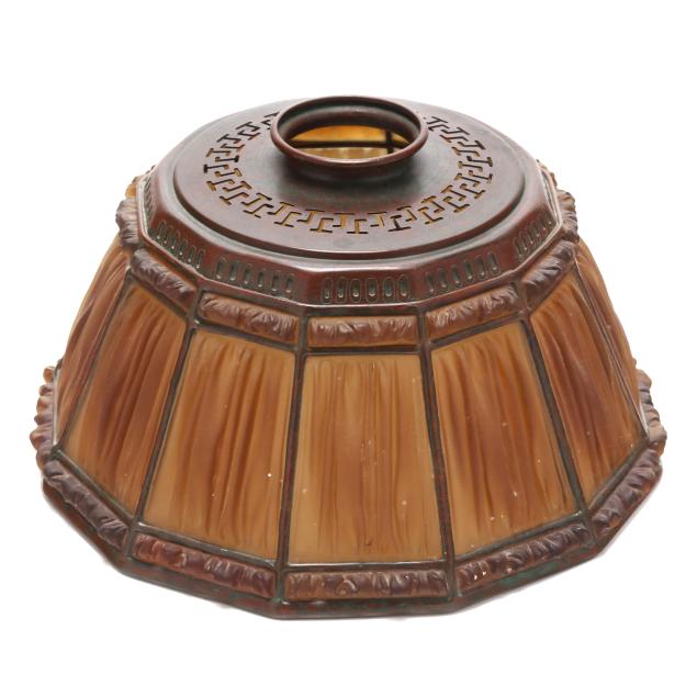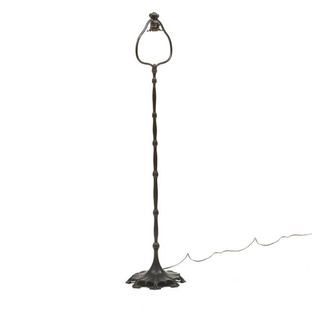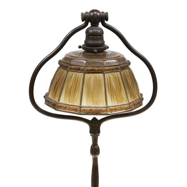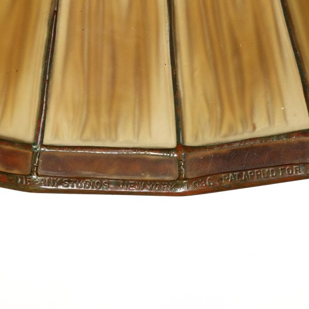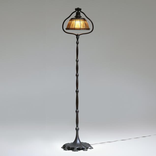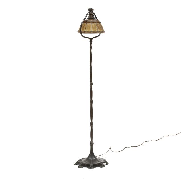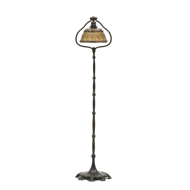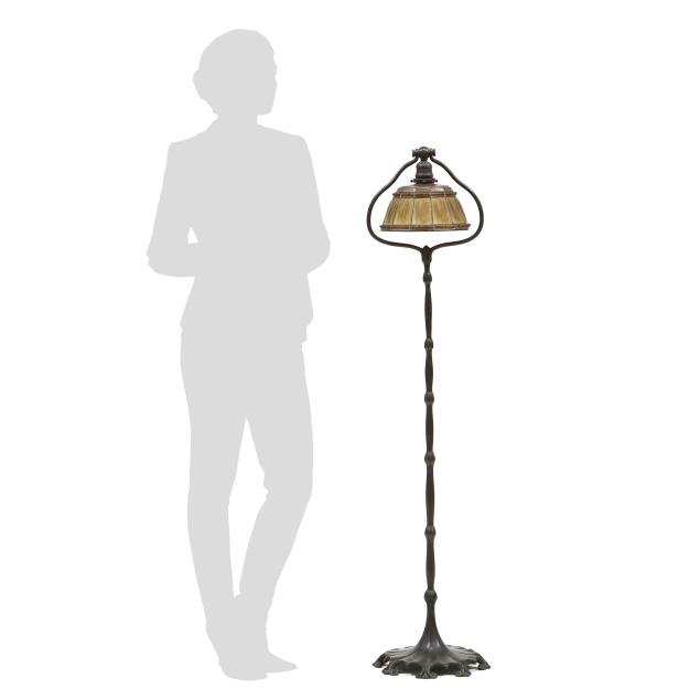 New York, circa 1915, 9 3/4-inch diameter dodecagonal leaded glass shade featuring ten caramel colored 'Favrile fabrique' panels framed above and below by sections of amber Tiffany Glass, beneath an integral reticulated patinated bronze cap, impressed "TIFFANY STUDIOS N.Y. PAT. APPL'D FOR 1936" to the shade base rim; (6 x 9 3/4 x 9 3/4 in.); mounted within a patinated bronze bell floor base, signed "TIFFANY STUDIOS / NEW YORK / 425", with art nouveau five foliate knop standard over a spreading base with eight scrolled feet. (55 1/2 x 13 x 13 in.).