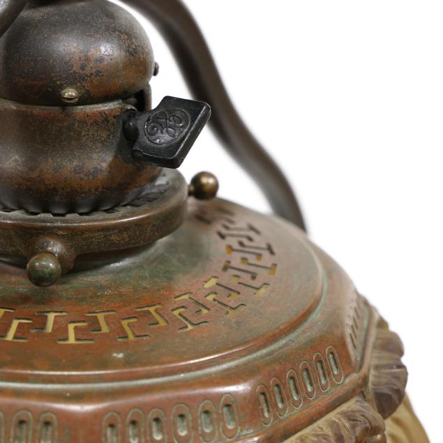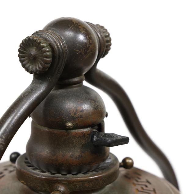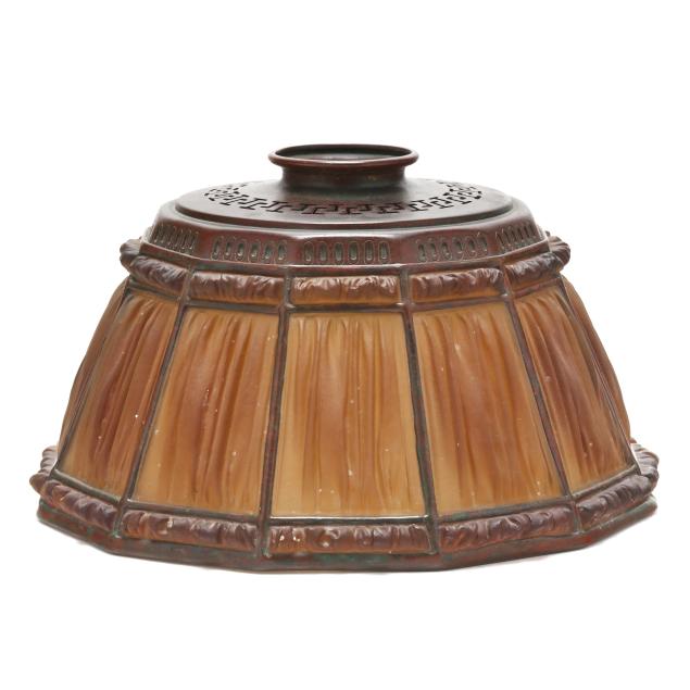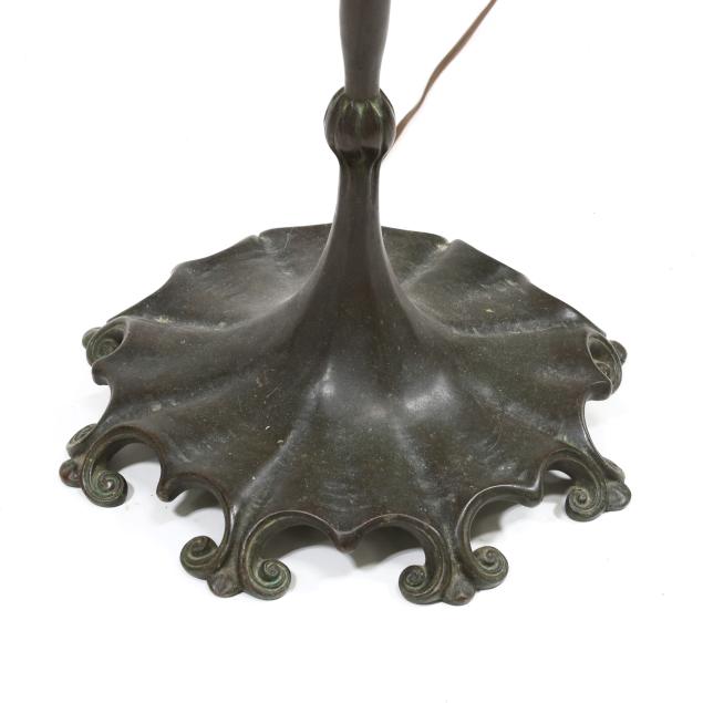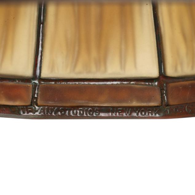 Shade with a few light surface scratches to metal; (2) smaller glass panels with small minor area of loss to interior perimeter edge. Base with some areas of rubbing to the patina, and light areas of oxidation to the underside; later wiring and paddle switch, and one later ball shade tightening screw.