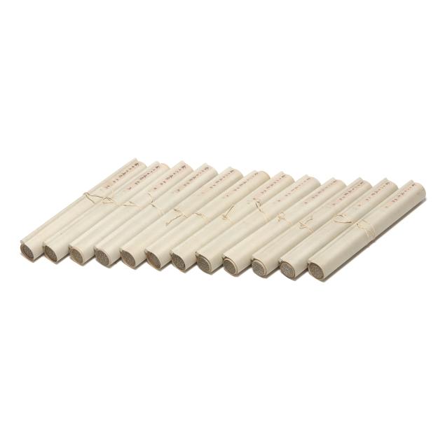 Very good estate condition; third scroll with some repairs to lower brocade margin by roller; fifth scroll with a slight tear to brocade mount at lower right; eighth scroll with repair to lower brocade margin; a light mark to upper portion of the sixth and tenth scrolls; some foxing to upper brocade margins on mainly first six scrolls; light even toning to silk on all.
