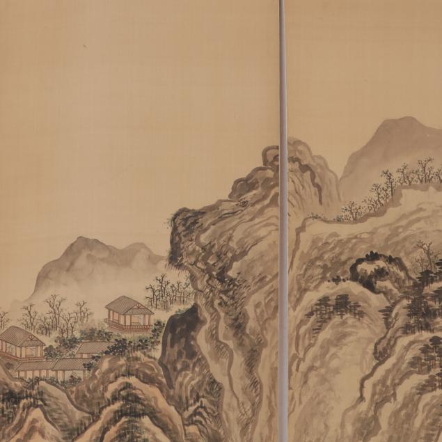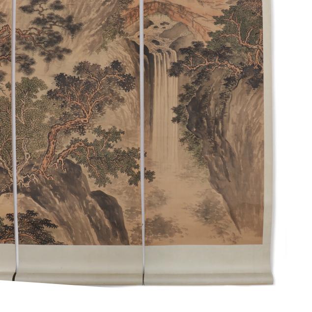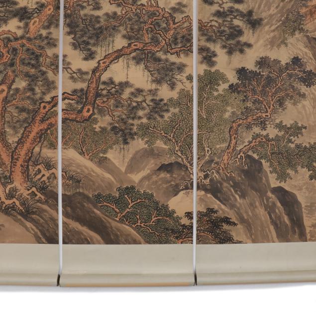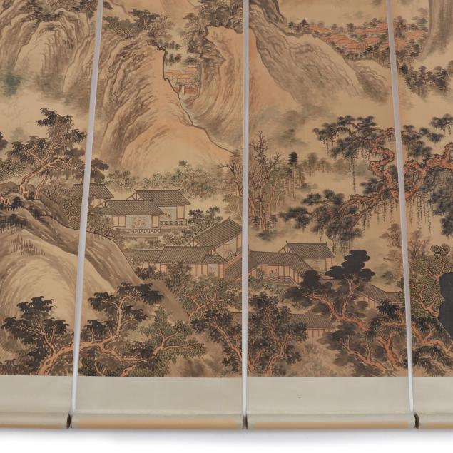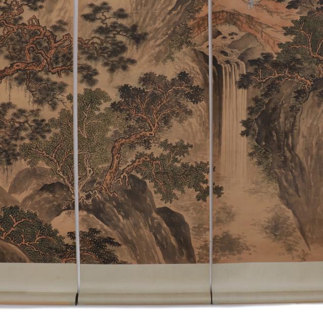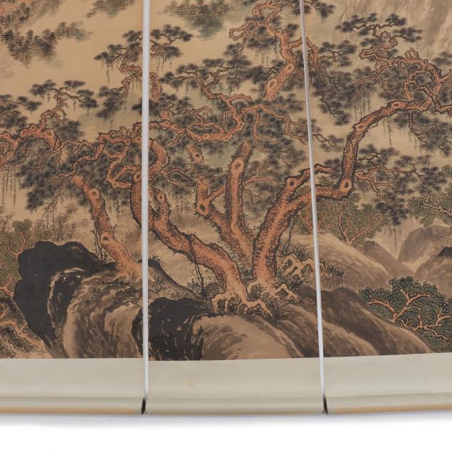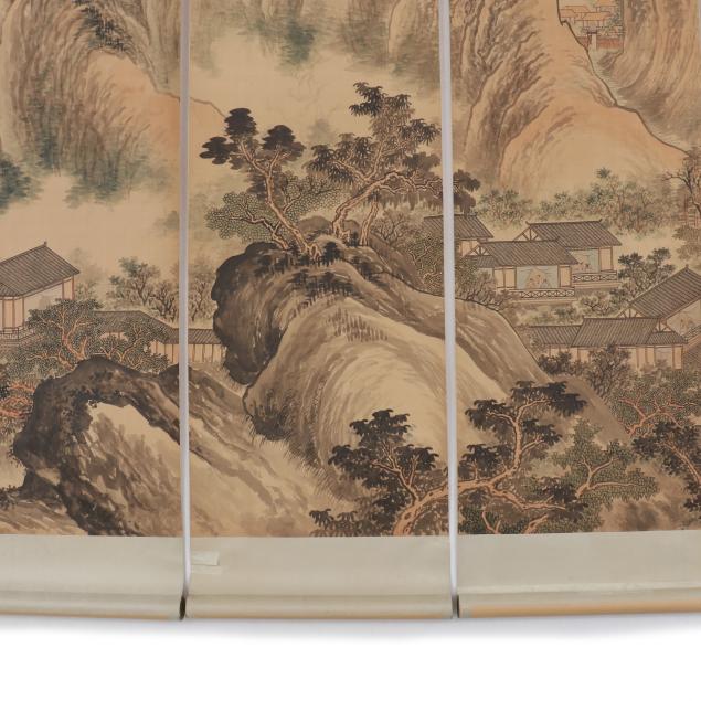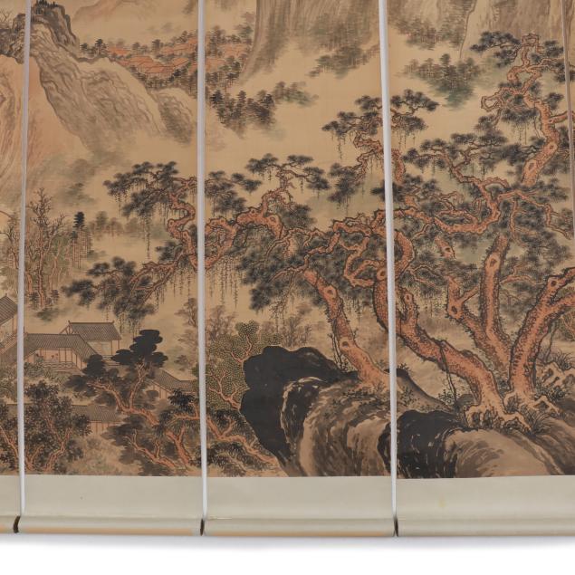 This 20th century Chinese artist may have taken inspiration from past painting masters and chosen to emulate their expansive landscape scroll sets such as "The Palace of Nine Perfections" by Yuan Jiang (active ca. 1680-ca. 1730) in the collection of the Metropolitan Museum of Art (1982.125a–l) or "Sublime Landscape" by Yuan Yao (Chinese, active 1730-1778) in the collection of the National Gallery of Victoria, Melbourne (1292.a-l-D5). The set of landscape paintings on offer here exhibits the same grandness of scale and serenity of scene.