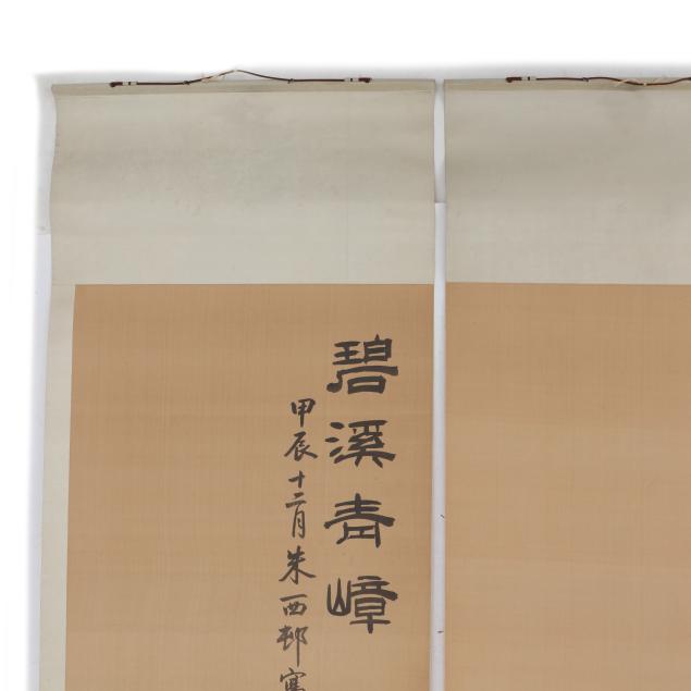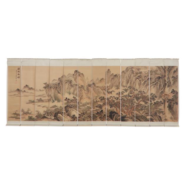 Dated 1964, ink and colors on silk, each painting with silk brocade mount and wooden rollers, the last scroll has an inscription to upper section with the title 碧溪青峰 (Emerald Streams and Jade Mountains), and date 甲辰十二月 (12th month of the year of Jiachen), and signature of artist 朱西邨 (Xi Cun Zhu) together with two red artist seals, the twelve scrolls hung together create a continuous picturesque Chinese mountain landscape.