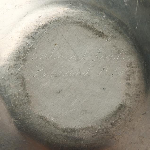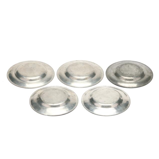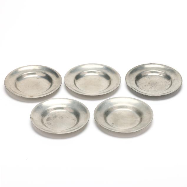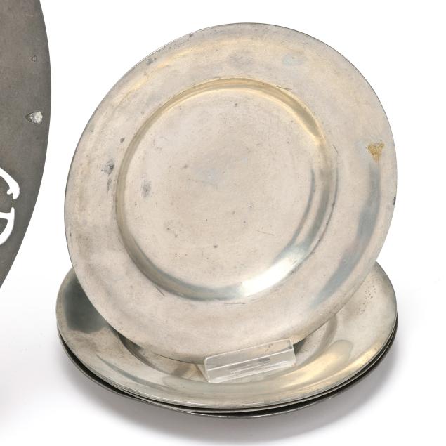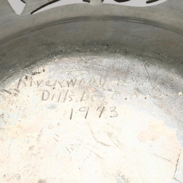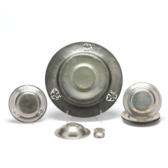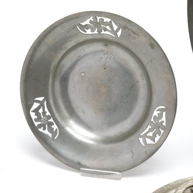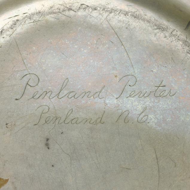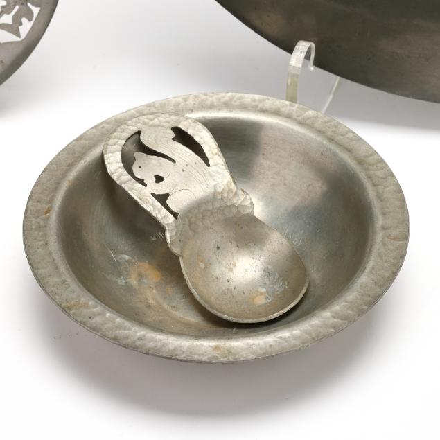 (9) pewter dishes, to include (5) small plates, second quarter 20th century, inscribed "Penland Weavers / and Potters / Penland, N.C." to underside; a third quarter 20th century salt bowl and spoon, both with hammered details, the spoon with cut squirrel to handle, both inscribed "Penland Pewter / Penland, N.C." to underside; a small plate with cut dogwood motif to rim, inscribed "Riverwood Pewter / Dillsboro, N.C. / 1973" to underside; and a circa 1940s charger with cut dogwood motif to rim, inscribed "Penland Pewter / Penland, N.C. / RSM" to underside.