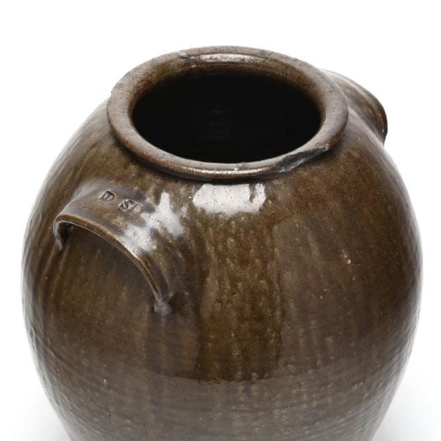 Circa 1850, ovoid stoneware jar with glossy green brown alkaline glaze, having a thin, slightly rolled rim and wide arched dual lug handles, featuring dark glaze runs from the shoulder and handle, one handle stamped "DS" within a rectangular reserve, the opposing handle is impressed with "5" denoting capacity.