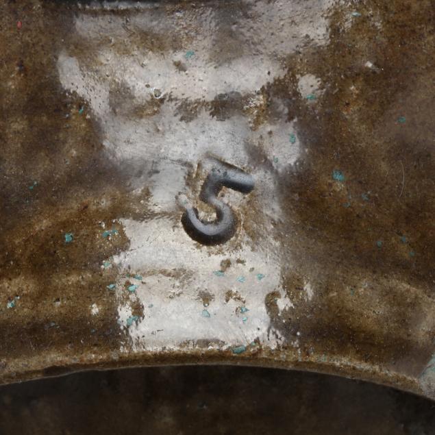 Chip to handle edge with "5"; some glaze crazing; some areas of chipping and loss to rim; some surface soiling underneath handles; a few greenish colored stains.
