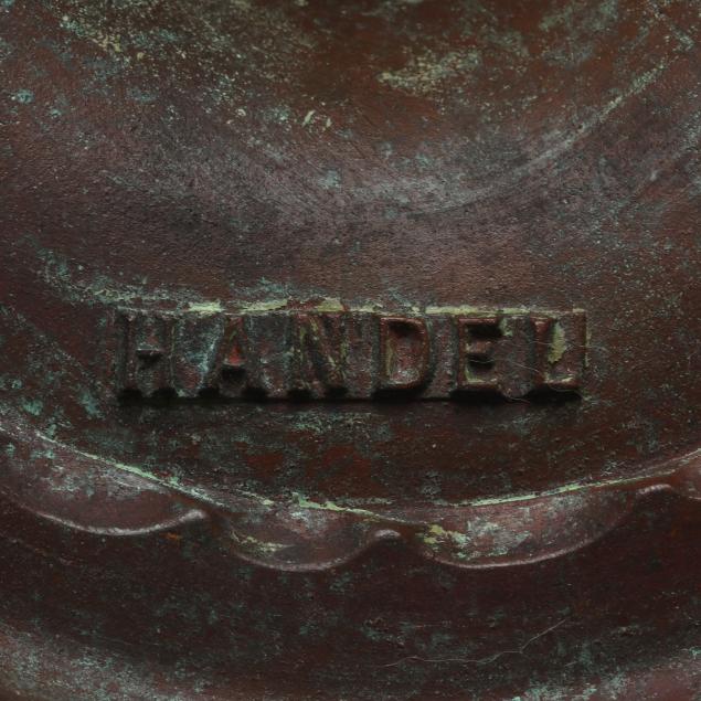 Not tested; the taller Handel lamp with severed cord (both parts included in lot), the other two with later wiring; verdigris to crevices; smaller Handel lamp without finial; scattered areas of patina wear and gilt loss; at least three sockets on shorter two bases are later.