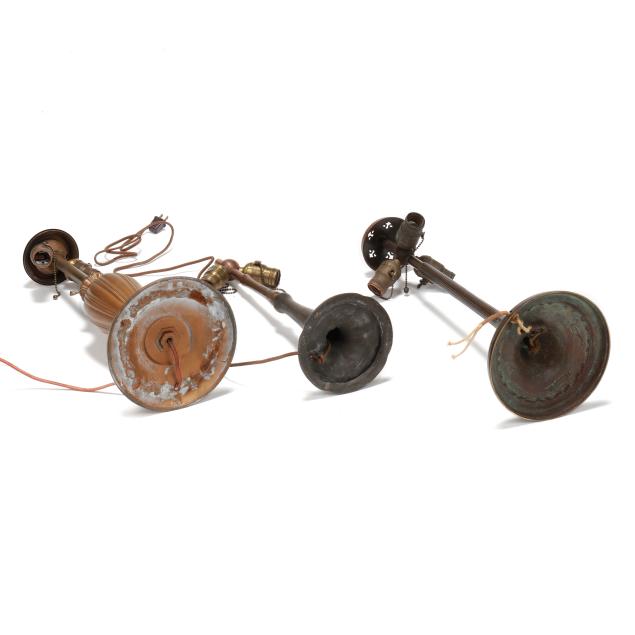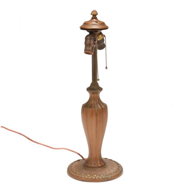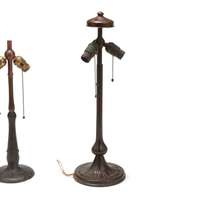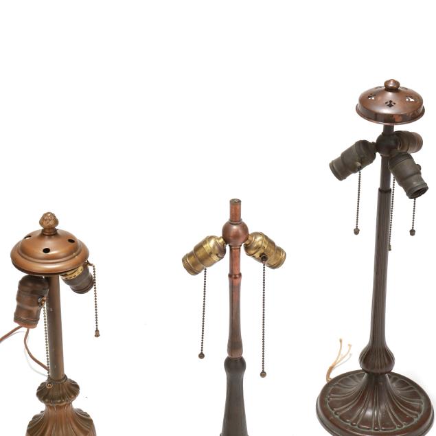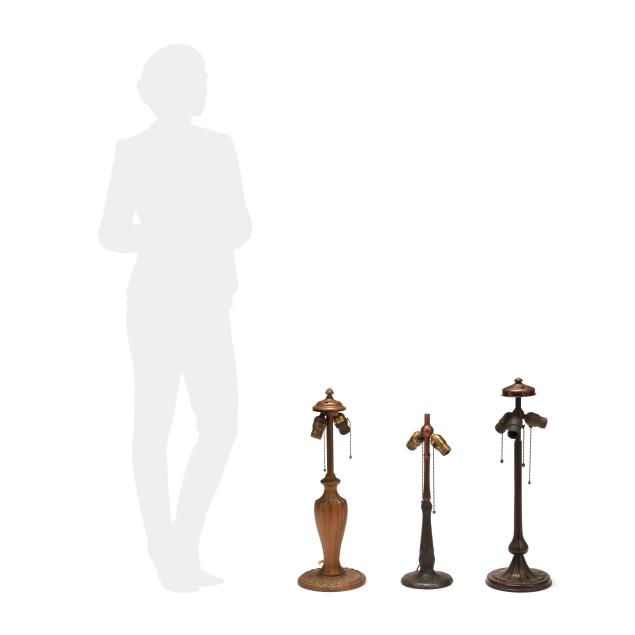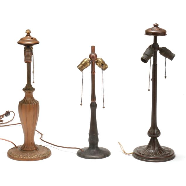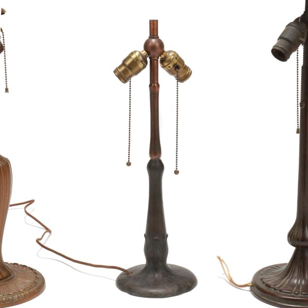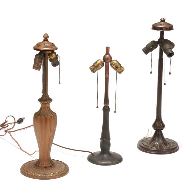 Early 20th century, to include (2) forms by Handel in the Art Nouveau taste: the shortest, a two-light form with foliate cast base, marked to base edge (19 1/2 in.), the second a three-light cluster form cast in bronze with brown patina, of spreading reeded design with shade rest and finial, stamped "HANDEL" and "1932" to underside (23 3/4 in.); the third cast in Neoclassical style with gilt finish, two-light form lamp, with shade rest and finial, appears unmarked (22 3/4 in.).