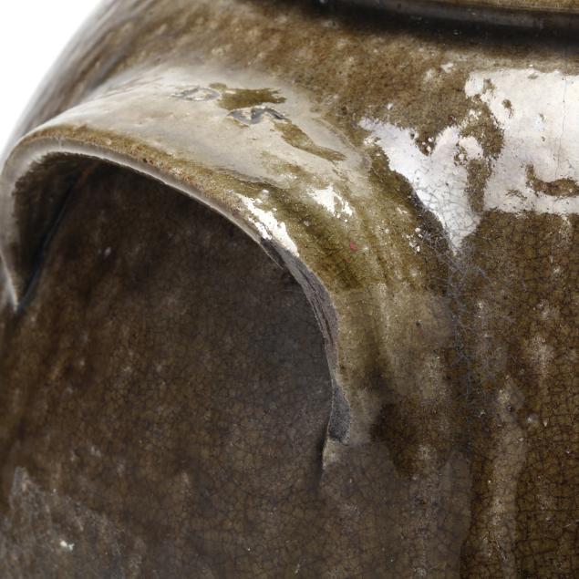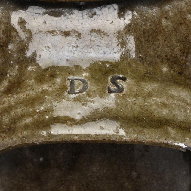 Circa 1850, ovoid stoneware jar with glossy green brown alkaline glaze, having a thin, slightly rolled rim and wide arched dual lug handles, featuring dark glaze runs from the shoulder and handle, one handle stamped "DS" within a rectangular reserve, the opposing handle is impressed with "5" denoting capacity.