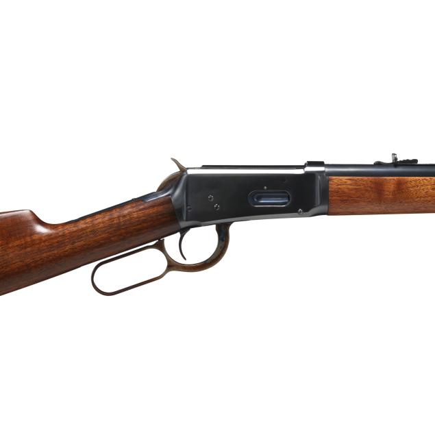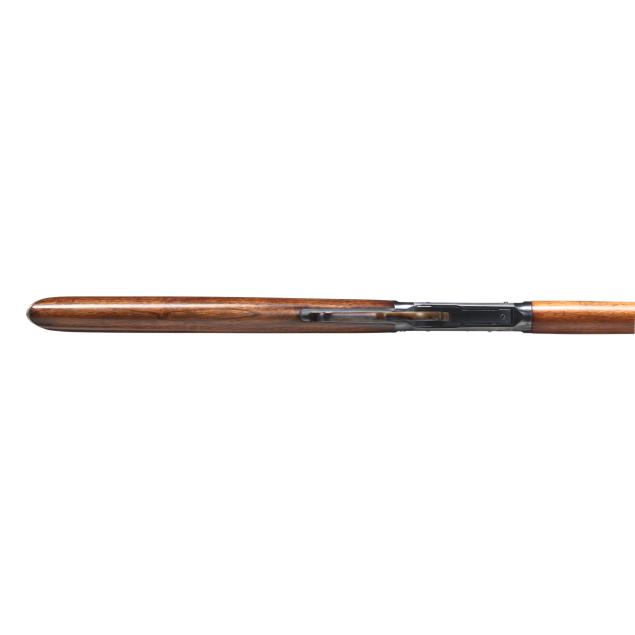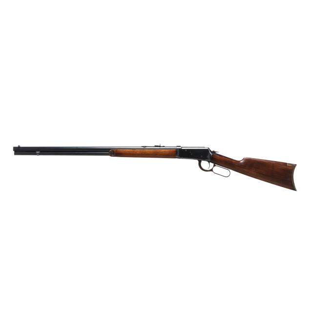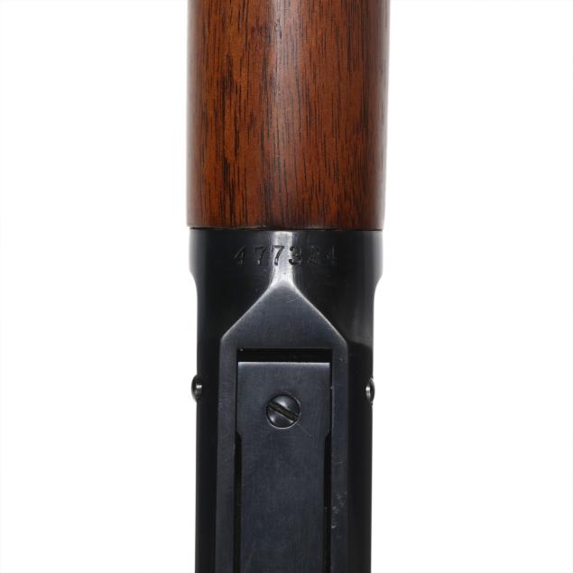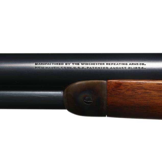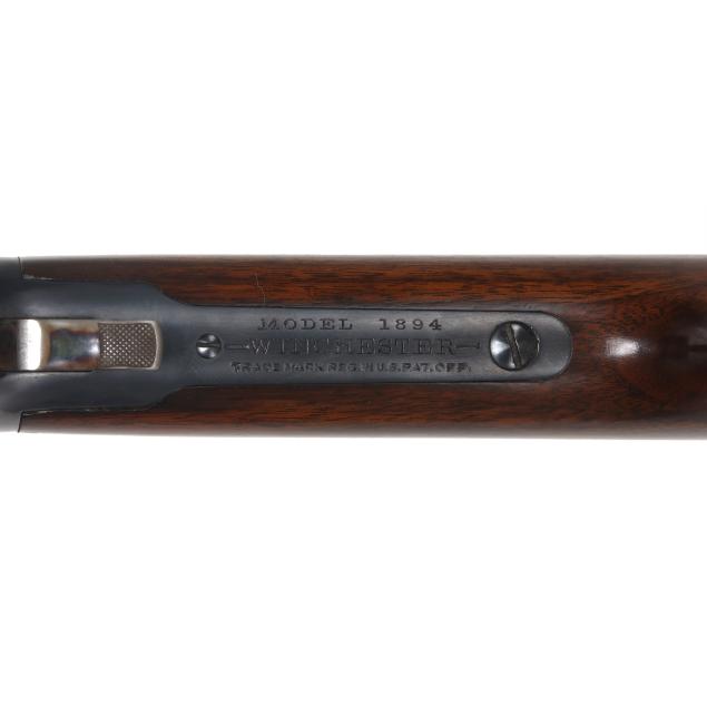 Serial number 477324 present on belly of lever action receiver, text of WINCHESTER MODEL 1894 present of receiver top tang, ext of MANUFACTURED BY THE WINCHESTER REPEATING ARMS CO. 32-40 present on 26 in. round blued steel barrel with dovetail front sight and dovetail rear sight with elevator, color cased trigger, hammer, lever, buttplate and forend cap, smooth walnut stock and forend.