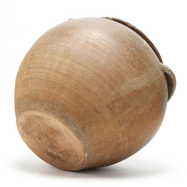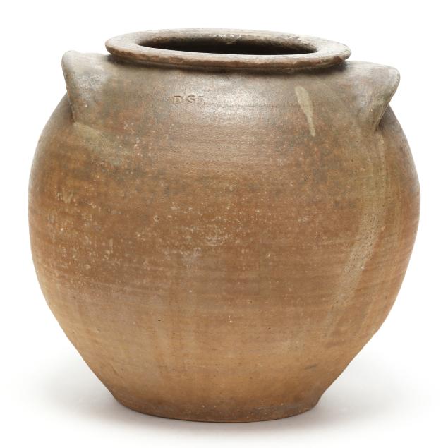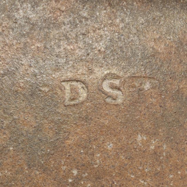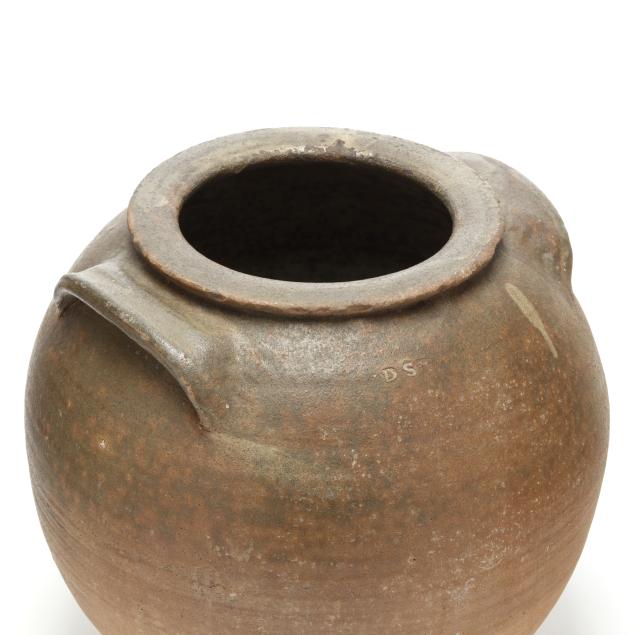 Circa 1850, stoneware with light green alkaline glaze, impressed "DS" mark to the shoulder, without capacity mark, approximately 3 gallon stately ovoid form having a thin, slightly rounded flat rim and very wide arched dual lug handles, underside with later accession number.