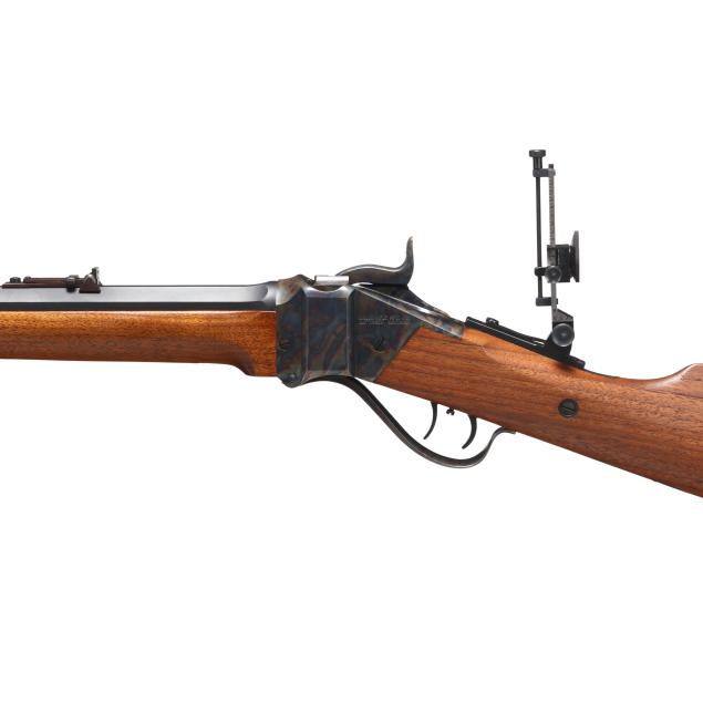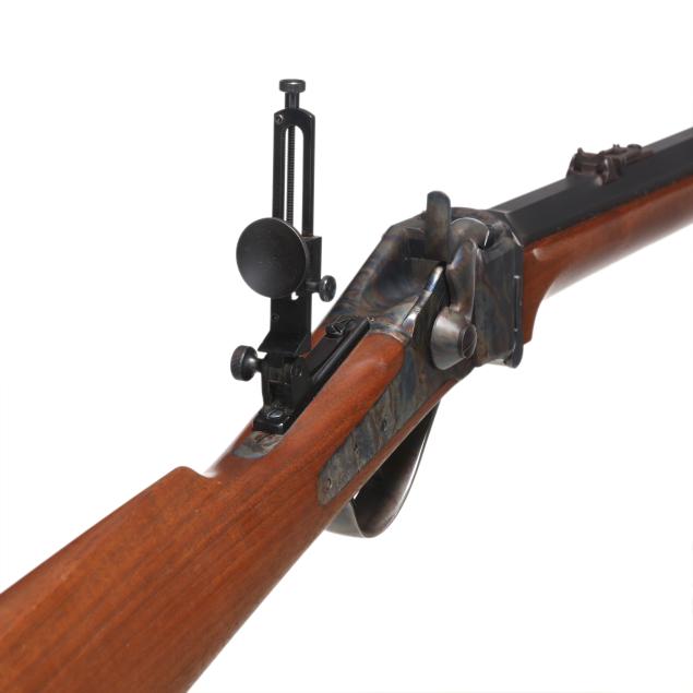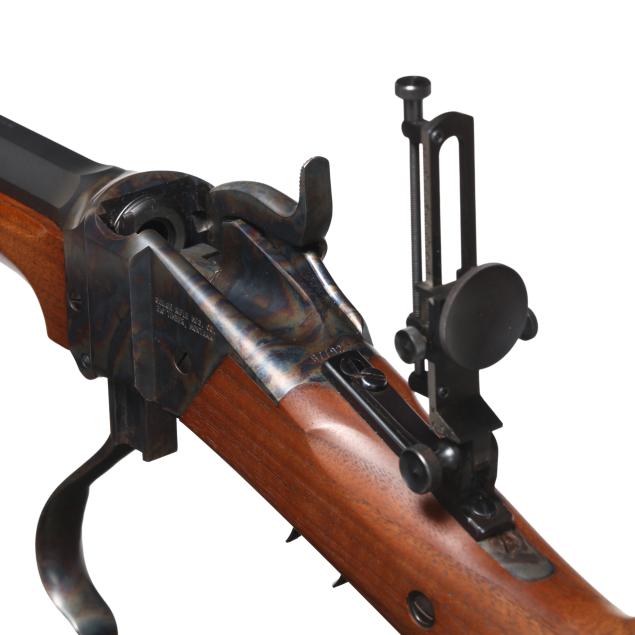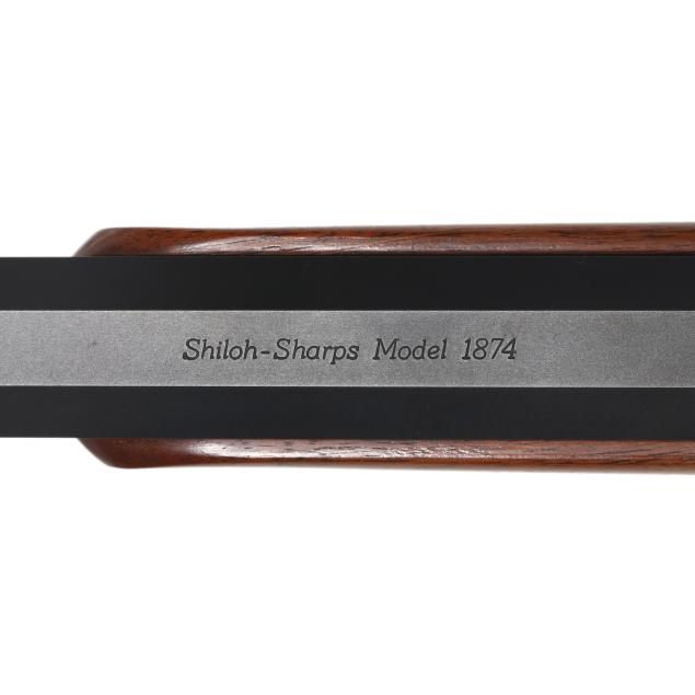 Serial number B7792 present at rear of color cased Sharps falling block action receiver, text of SHILOH RIFLE MFG. CO. BIG TIMBER, MONTANA present on left side of receiver, text of SHILOH-SHARPS MODEL 1874 and CALIBRE 45 2 1/10 present on 30 in. blued octagon barrel with dovetail and screw attached adjustable rear sight and dovetail front globe sight, C. SHARPS ARMS CO. INC. adjustable rear tang sight, color case hammer, trigger guard, buttplate, and action lever, double set trigger with adjustment screw, smooth walnut stock and forend.