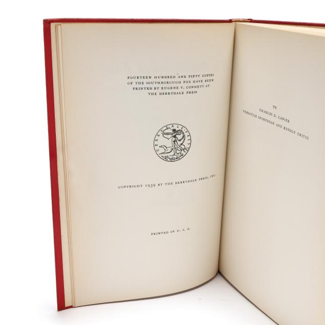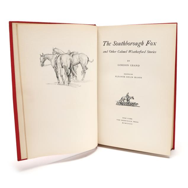 The Southborough Fox and Other Colonel Weatherford Stories. New York: The Derrydale Press, 1939. One of 1450 copies. Signed by Gordon Grand on the half-title. Red pebbled cloth-covered boards stamped in gilt. 8vo; [14], 239, [1]pp. Illustrated with drawings by Eleanor Iselin Mason. (Light toning and grime to interior; small sticker to rear paste-down; gift inscription from Hugh Chatham. Very good.)