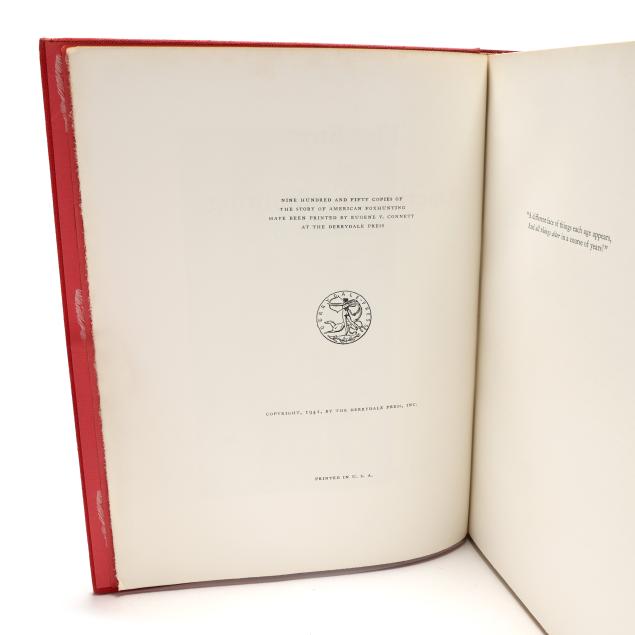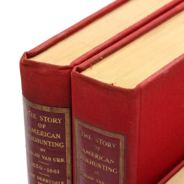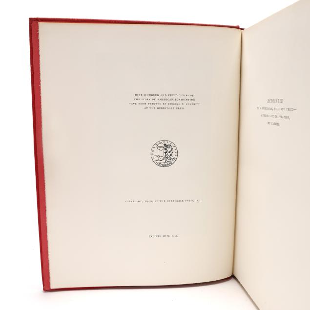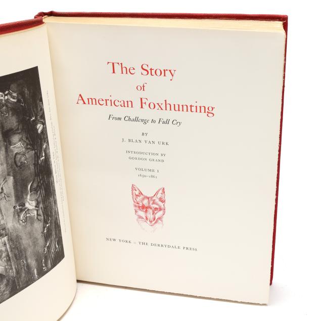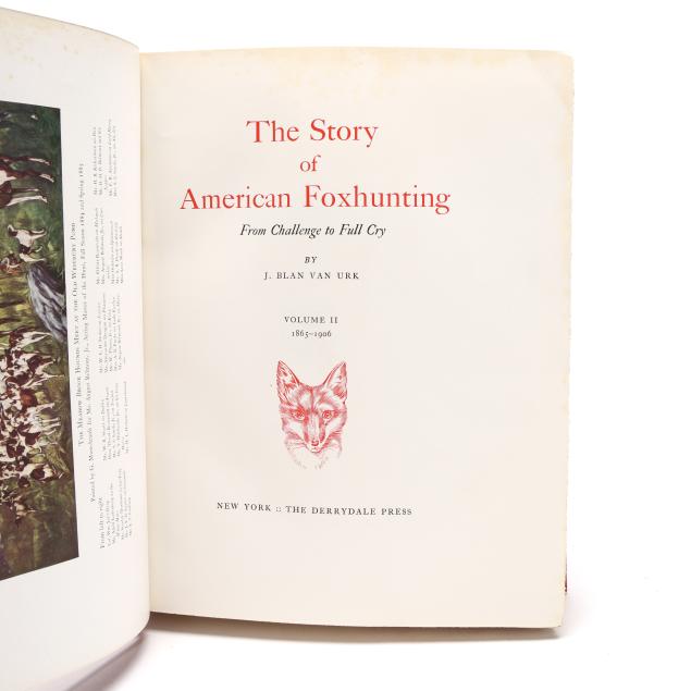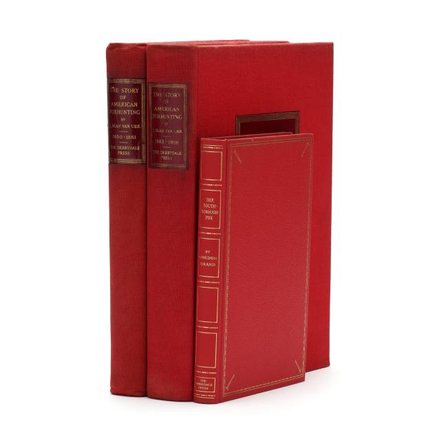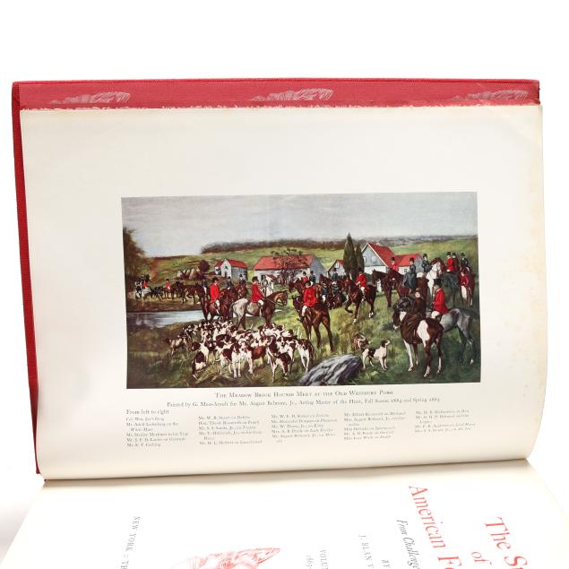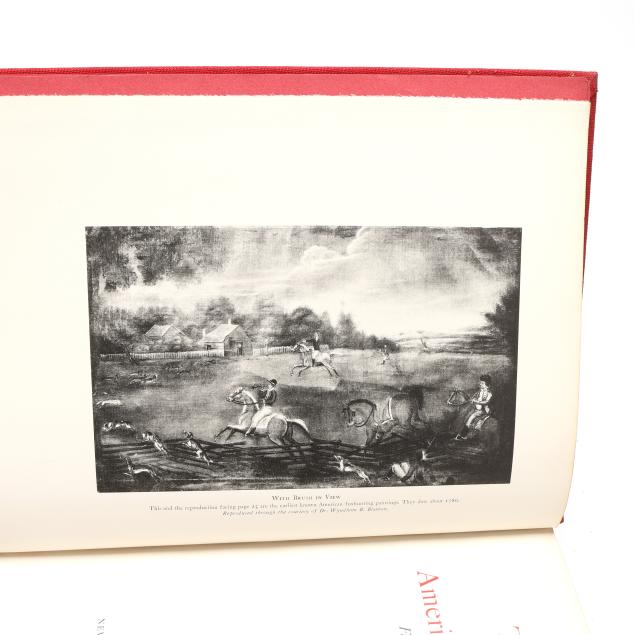 Volume II (1865-1906). (2) volumes (complete). New York: The Derrydale Press, [1940-1941]. One of 950 copies. Red cloth-covered boards with gilt-stamped maroon paper label on the front cover and spine, with top edge gilt, the other edges untrimmed, and fox patterned endpapers. Large 4to; xxxi, [3], 283pp.; xx, [2], 435pp. Each volume with frontispiece and numerous illustrations; volume I with an introduction by Gordon Grand. (Mild wear to boards, spines darkened and ends lightly rubbed; interiors with rare grime or minor handling wear, and the free endpapers with small areas of tape residue; volume I with area of gutter wear after free endpaper; volume II with foxing concentrated on frontispiece and title page, in a protective jacket with wear; some leaves still unopened. Very good.)