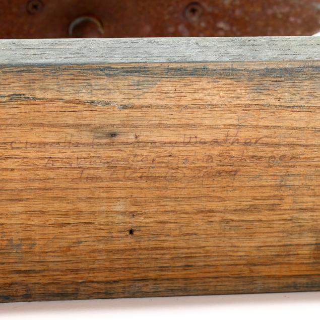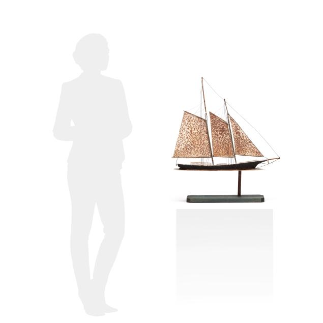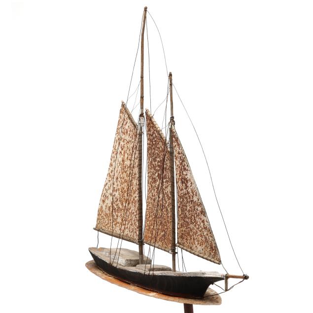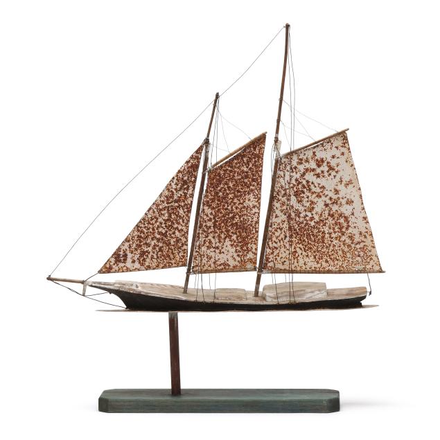 2009, painted wood and metal model of a Gloucester fishing schooner mounted to rectangular plinth, inscribed "Close Headed Heavy Weather / A Gloucester Fishin Schooner / Jim Clark © 2009" to underside.