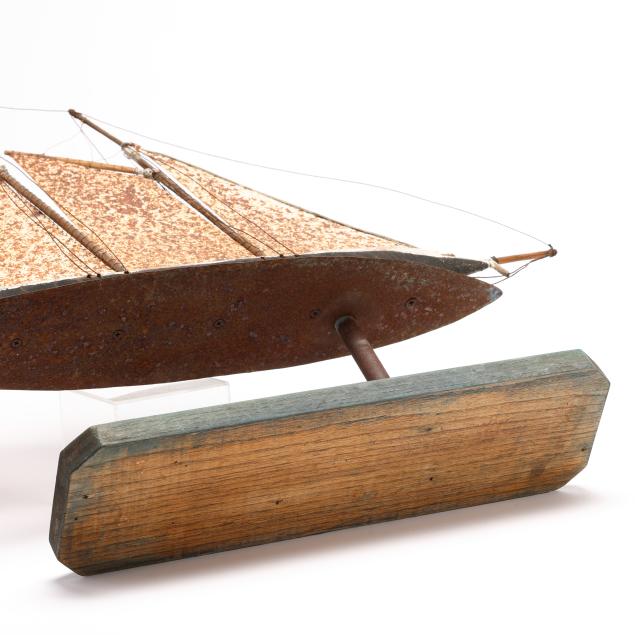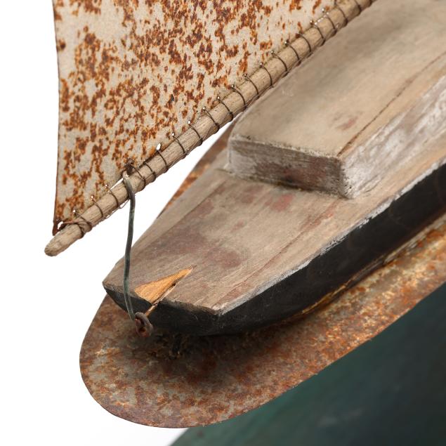 Rusting to all metal components; chip to wood at stern of ship with associated looseness to mounted sail; some cracking and chipping at base of ship; wood with some loss to paint on ship.