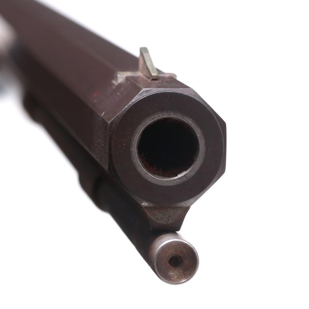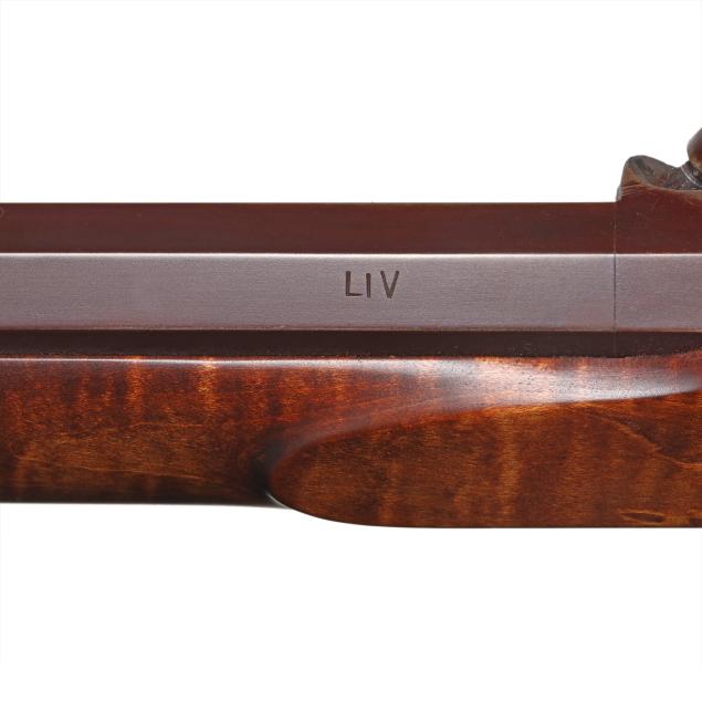 No visible serial number (NVS), browned percussion cap lock work, text of J. F. BERGMANN and LIV present on 36 5/8 in. browned octagon barrel with dovetail front and rear sights, double set trigger with adjustment screw, silver colored escutcheons, browned steel trigger guard and buttplate, wooden ramrod with silvered tip, figured walnut half stock.