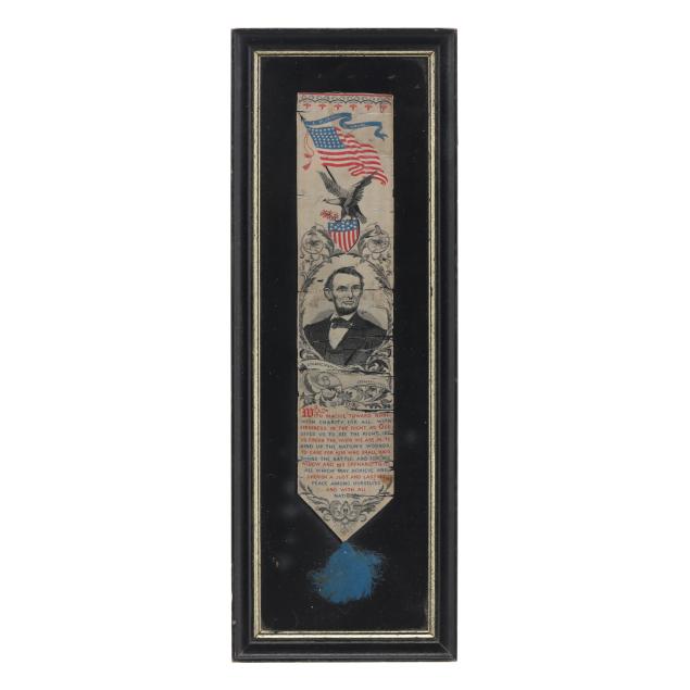 The first is a scarce oversize ribbon from 1861 designed by S. Chèvre and made by Isaac Dreyfus of Basel, Switzerland in order to celebrate Lincoln's first inauguration (5 x 9-3/8 in.) (minor spotting, else crisp and clean); the second ribbon is an elusive memorial from 1865 featuring an abbreviated excerpt from the slain President's second inaugural speech (2.75 x 14 in.)(light browning with some fracturing to the silk).