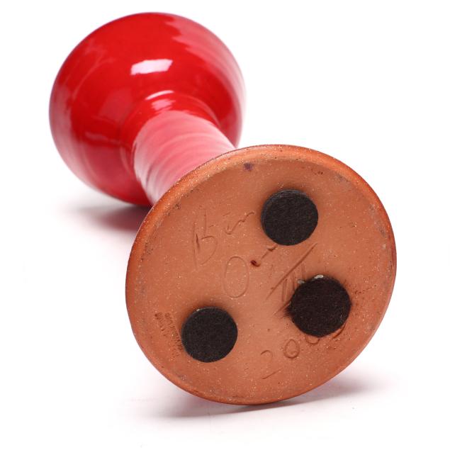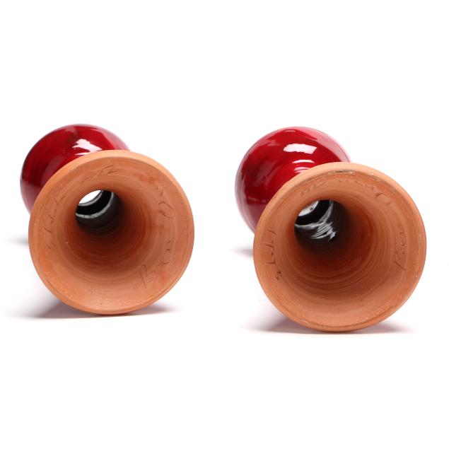(4) Chinese red glazed earthenware forms to include a 2023 ribbed centerpiece bowl (12 in. diameter); a pair of 1993 hollow candlesticks (10 in.); and a 2003 candlestick (9 3/4 in.), all signed and dated to underside.