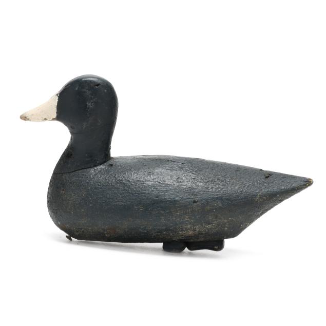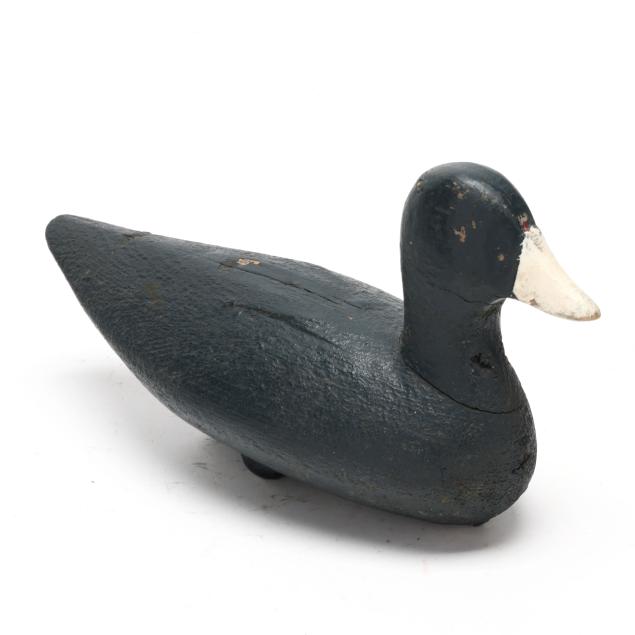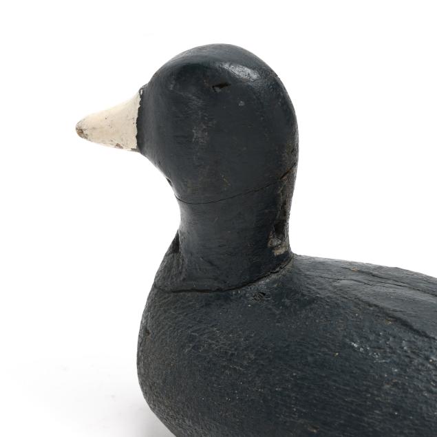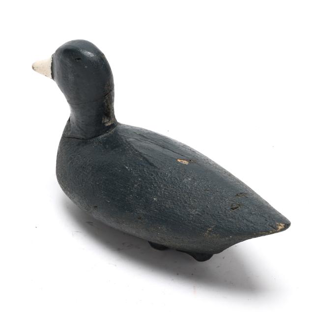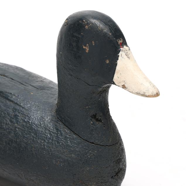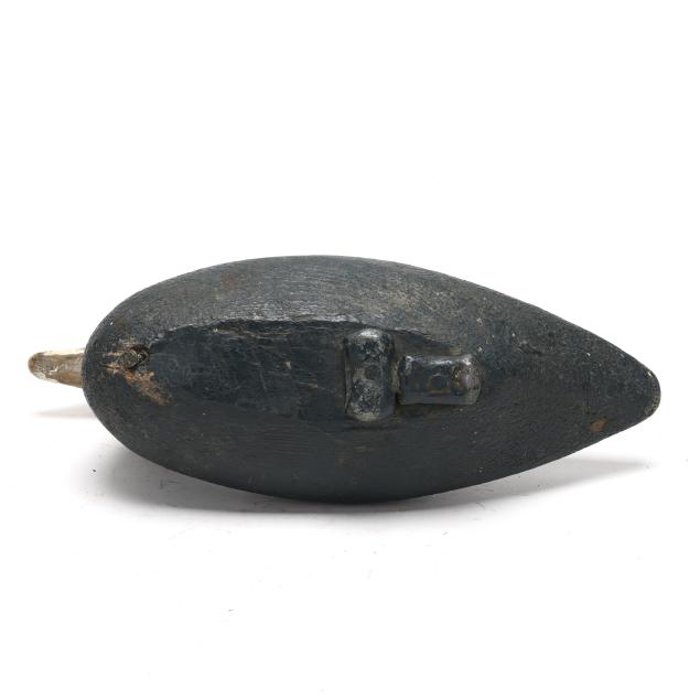 Frak Carter, a Coinjock hunter, had a decoy stand that included over 75 Ned Burgess coots. They can be identified by their straight tails and bluish tint over paint. Net weights were used as ballast weights on the smaller examples and all have paint on them. The small examples such as this decoy are the most rare.