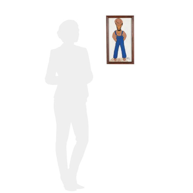 1997, acrylic on board, depicting a standing man in blue overalls and hat with white ground, possibly a self portrait, set within wood frame, signed and dated to lower right.