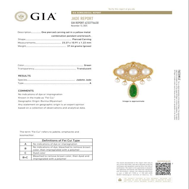 With GIA report stating Jadeite Jade, type A, with no indications of dye or impregnation, known in the trade as "Fei Cui", and with a geographic origin of Burma (Myanmar).