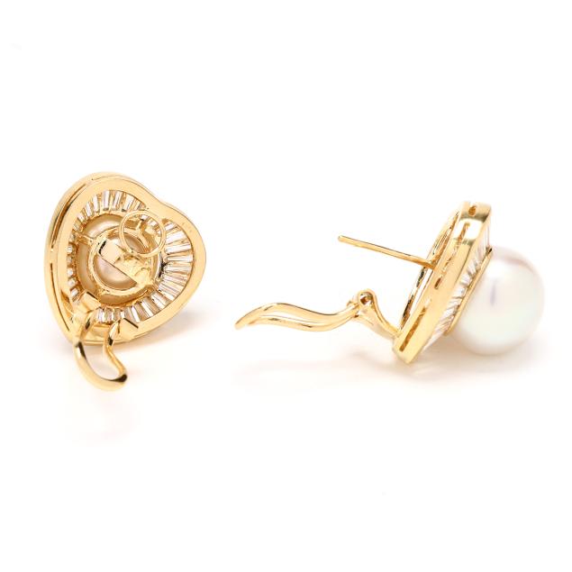 Centered on a round cultured South Sea pearl (12.5-13.0mm) within a surround of channel set tapered baguette cut diamonds weighing approximately 4.25 total carats (H-I color, VS1-VS2 clarity), stamped 18K / 750.