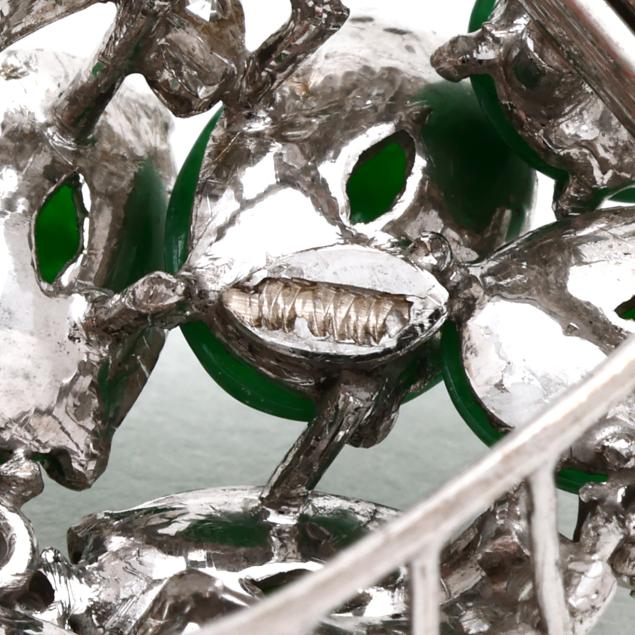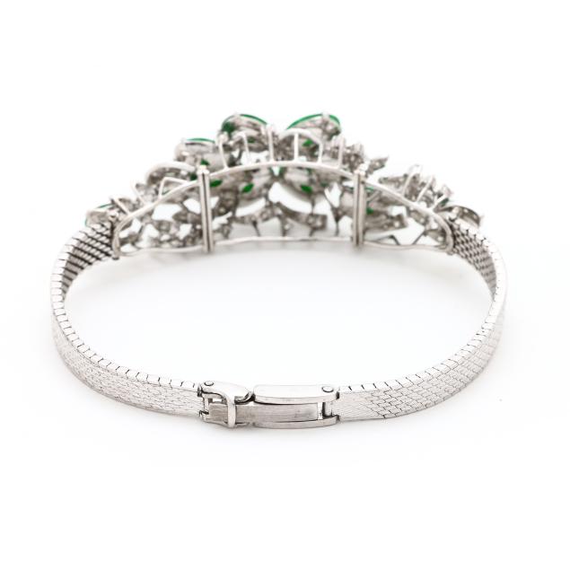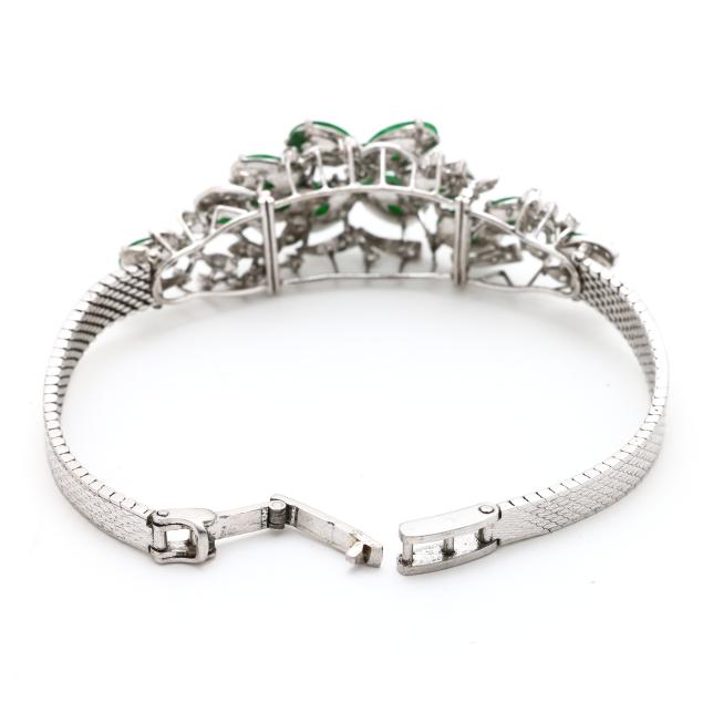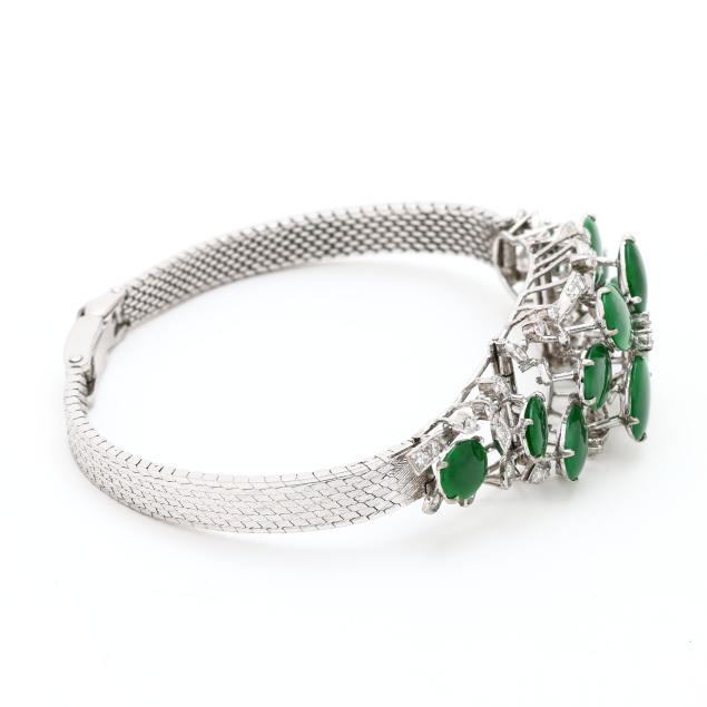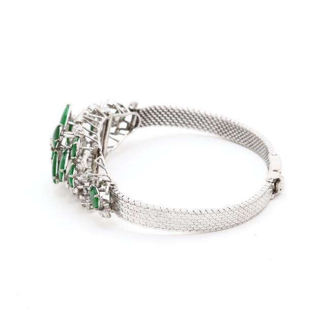 Central section set with oval cabochon cut jadeite jade and single cut diamonds weighing approximately .75 total carats (G-H color, VS2-SI2 clarity) in a floral motif, joined to a bright cut engraved bracelet and completed with a fold over clasp, possible stamp, XRF testing silver.