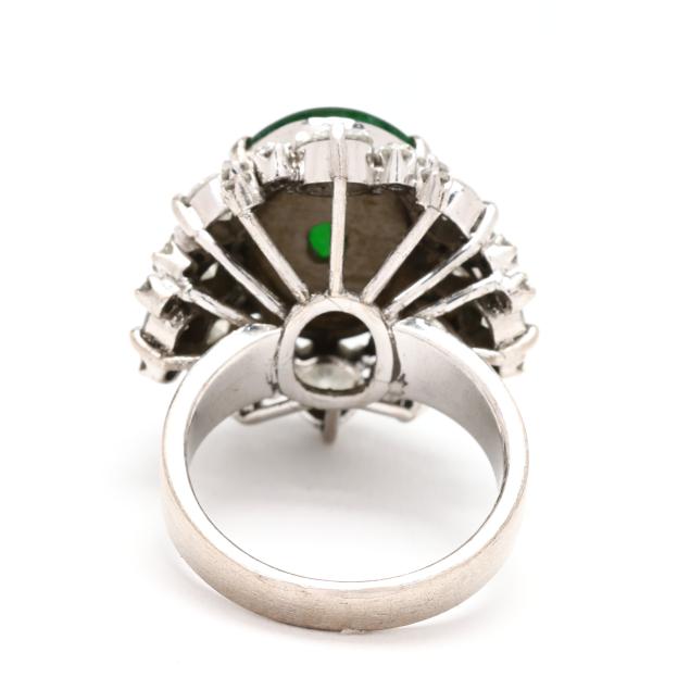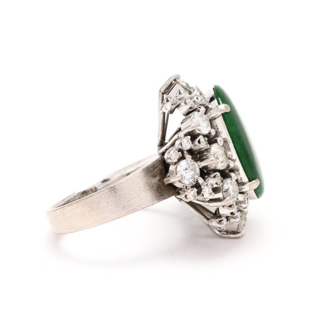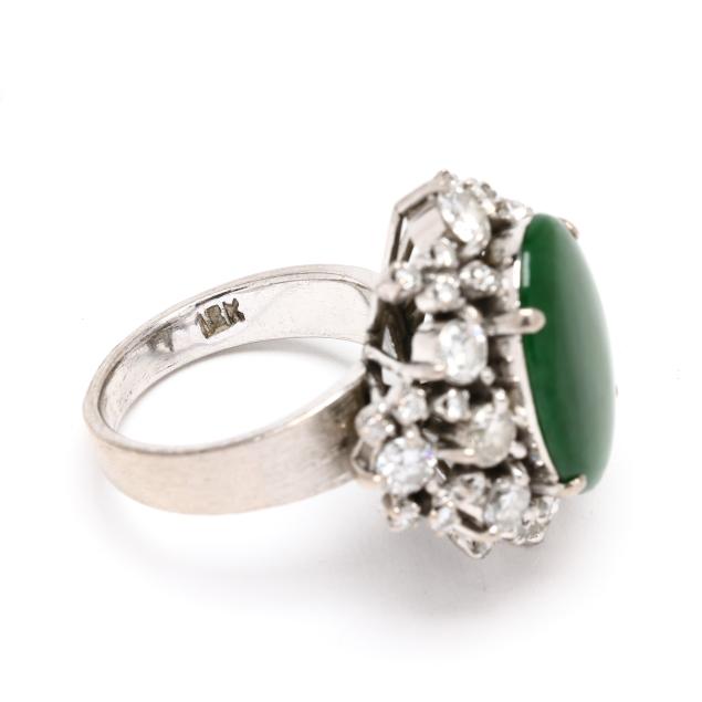 Centered on a prong set oval tablet cut jadeite jade, within a surround of full cut round diamonds weighing 2.66 total carats (J-K color, SI2-I1 clarity), on a tapering flat shank, stamped 18K, XRF testing silver.