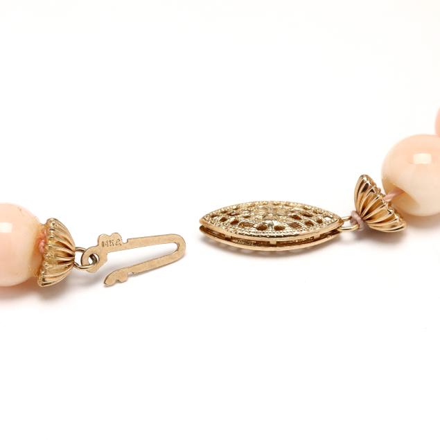 To include: a necklace strung knotted with (50) round coral beads (8.0mm to 8.5mm) and completed with a filigree clasp stamped 14K (18.75 in.); and a carved coral slide / brooch in the form of a flower bouquet, completed with a single locking pin stem and a double bail (1.75 x 7/8 in.).